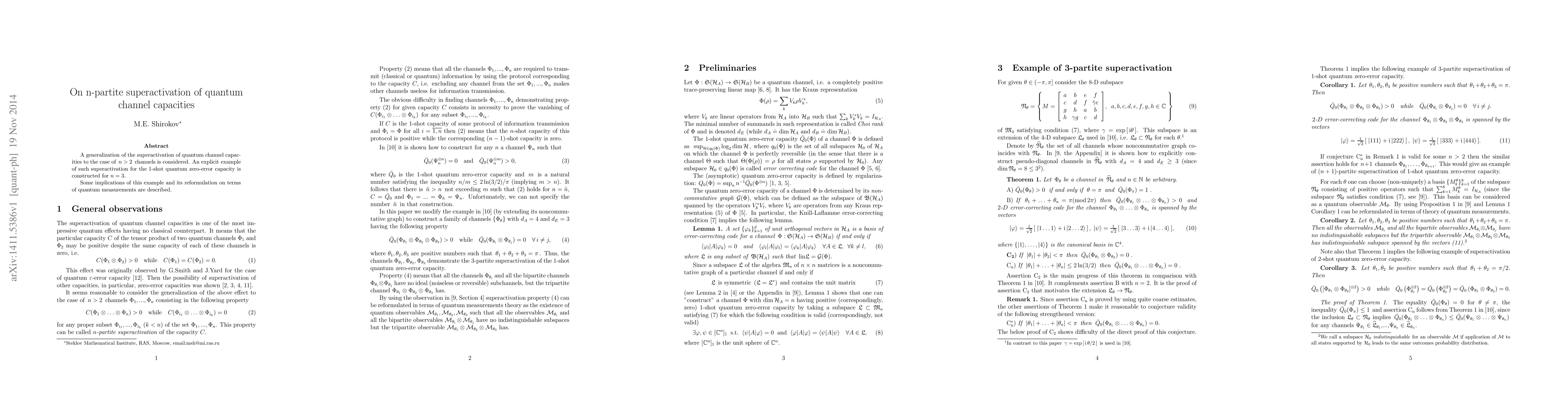 This paper generalizes the concept of superactivation of quantum channel capacities to more than two channels, providing an explicit example for n=3 in the context of 1-shot quantum zero-error capacity. It also explores the implications of this example through the lens of quantum measurements.