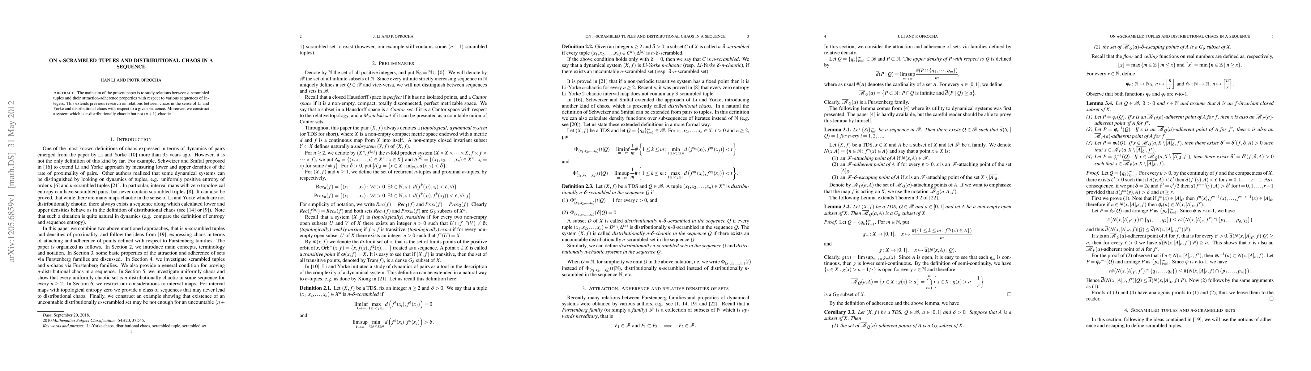 This paper investigates the connections between $n$-scrambled tuples and their attraction-adherence properties in relation to various integer sequences, extending previous studies on chaos and distributional chaos. It also constructs a system that exhibits $n$-distributional chaos but not $(n+1)$-chaos.