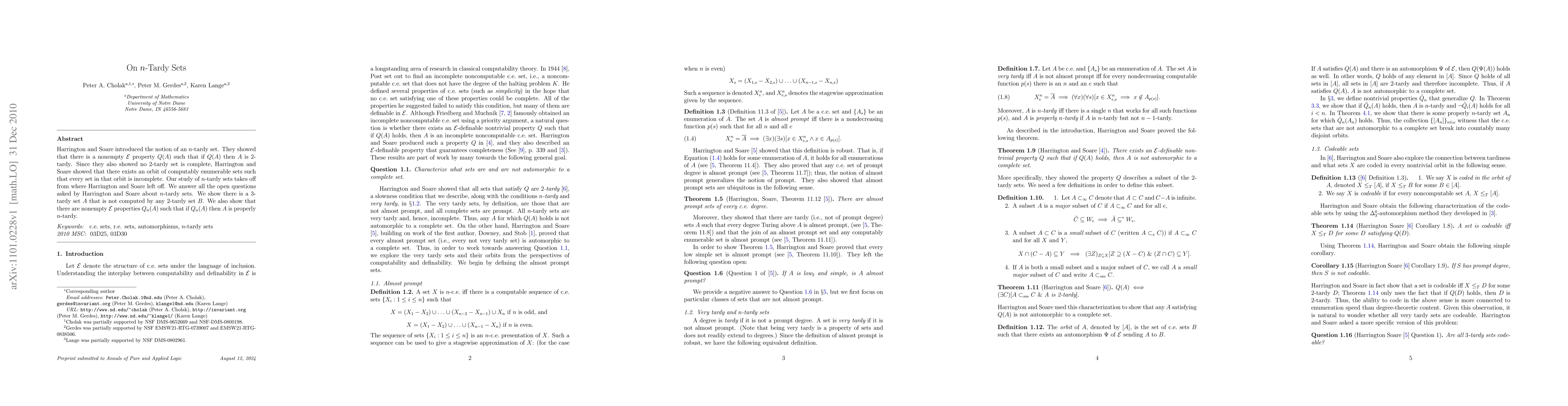 This paper builds on previous research by Harrington and Soare, answering open questions about n-tardy sets. It shows the existence of 3-tardy sets not computable by 2-tardy sets and proves properties Q_n(A) for proper n-tardy sets A.