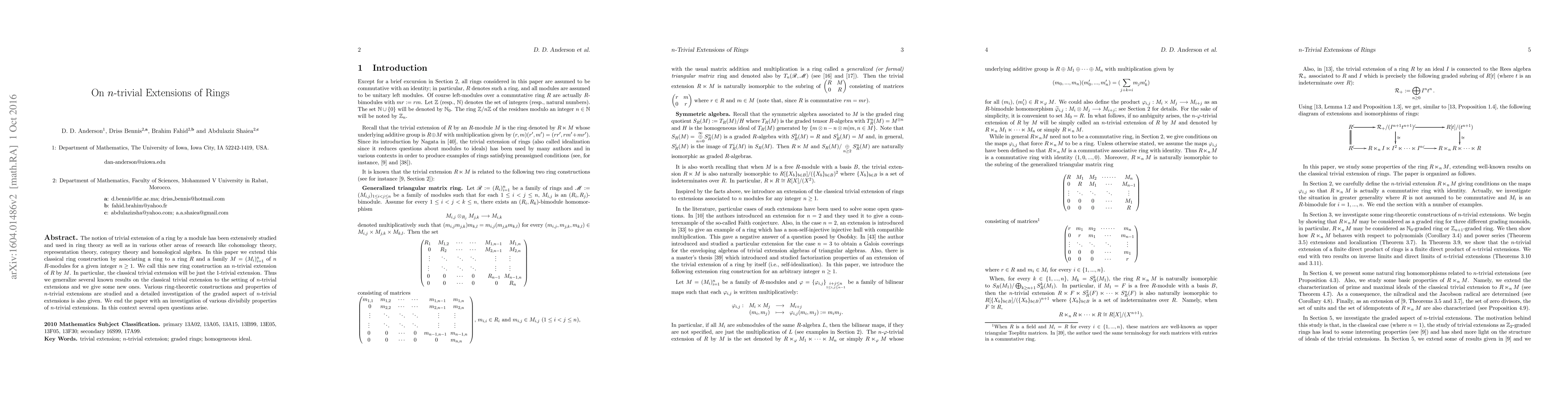 The notion of trivial extension of a ring by a module has been extensively studied and used in ring theory as well as in various other areas of research like cohomology theory, representation theory, category theory and homological algebra. In this paper we extend this classical ring construction by associating a ring to a ring $R$ and a family $M=(M_i)_{i=1}^{n}$ of $n$ $R$-modules for a given integer $n\geq 1$. We call this new ring construction an $n$-trivial extension of $R$ by $M$. In particular, the classical trivial extension will be just the $1$-trivial extension. Thus we generalize several known results on the classical trivial extension to the setting of $n$-trivial extensions and we give some new ones. Various ring-theoretic constructions and properties of $n$-trivial extensions are studied and a detailed investigation of the graded aspect of $n$-trivial extensions is also given. We end the paper with an investigation of various divisibily properties of $n$-trivial extensions. In this context several open questions arise.