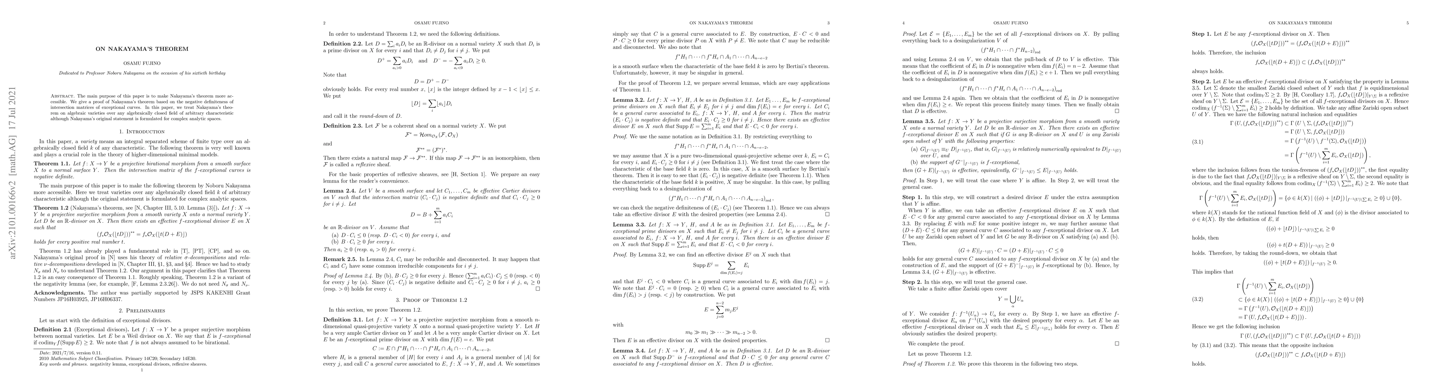The main purpose of this paper is to make Nakayama's theorem more accessible. We give a proof of Nakayama's theorem based on the negative definiteness of intersection matrices of exceptional curves. In this paper, we treat Nakayama's theorem on algebraic varieties over any algebraically closed field of arbitrary characteristic although Nakayama's original statement is formulated for complex analytic spaces.