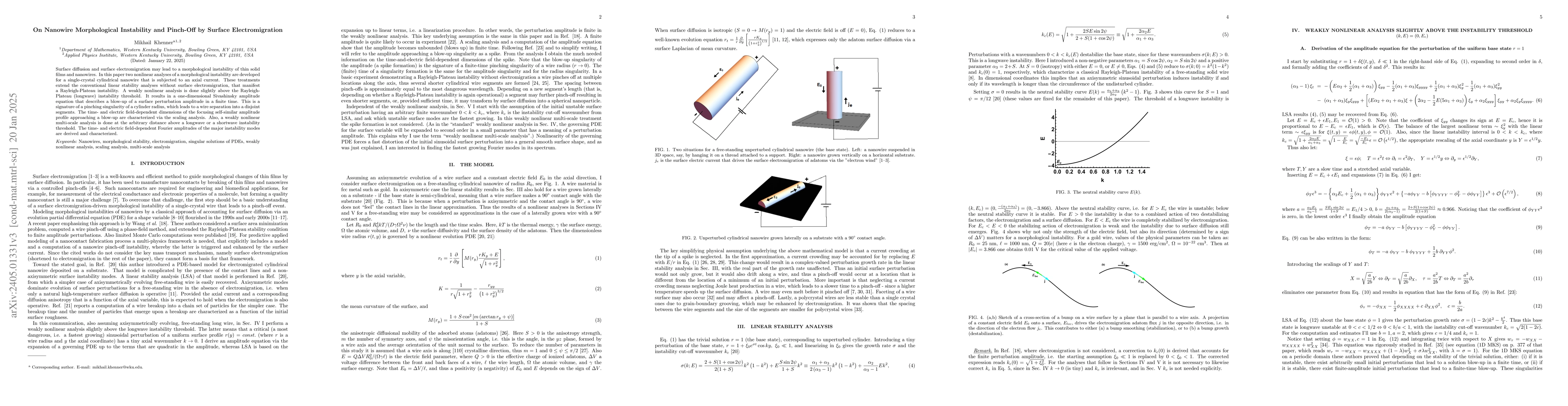 This paper develops nonlinear analyses to describe the morphological instability and pinch-off of cylindrical nanowires due to surface diffusion and electromigration under axial current. It derives equations to predict the finite-time blow-up of surface perturbations, leading to wire segmentation, and characterizes the time- and electric field-dependent dimensions of these instabilities.