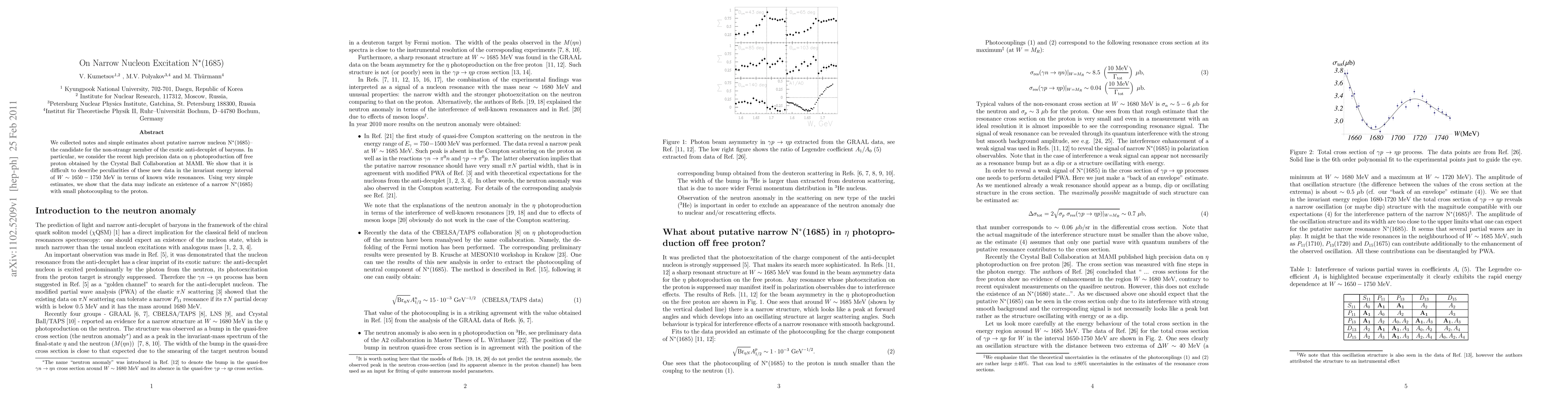 We collected notes and simple estimates about putative narrow nucleon N*(1685) - the candidate for the non-strange member of the exotic anti-decuplet of baryons. In particular, we consider the recent high precision data on eta photoproduction off free proton obtained by the Crystal Ball Collaboration at MAMI. We show that it is difficult to describe peculiarities of these new data in the invariant energy interval of W ~ 1650-1750 MeV in terms of known wide resonances. Using very simple estimates, we show that the data may indicate an existence of a narrow N*(1685) with small photocoupling to the proton.
