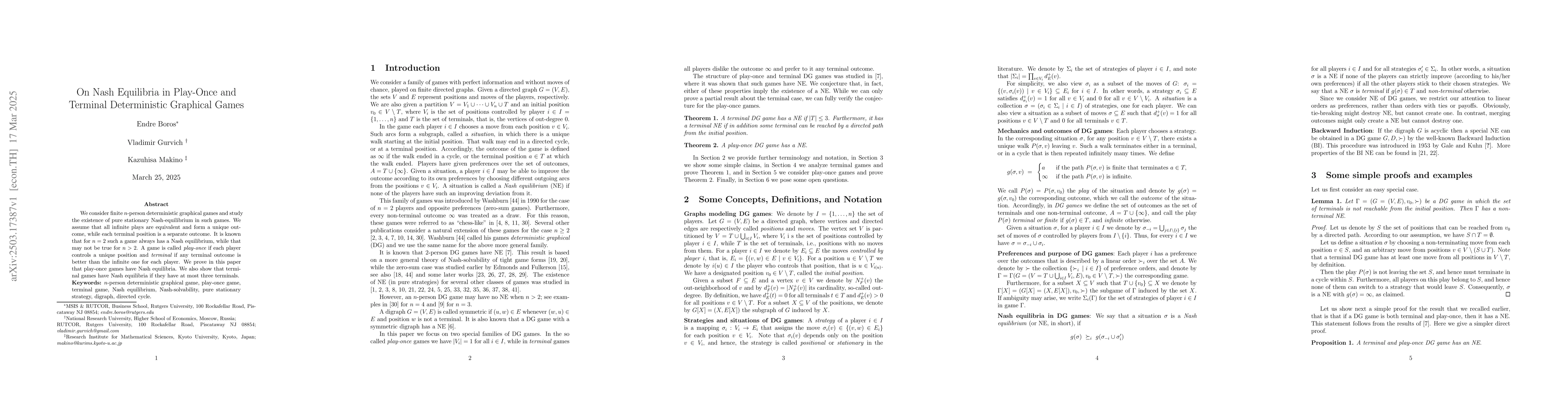 The paper proves the existence of Nash equilibria in play-once and terminal deterministic graphical games under specified conditions.