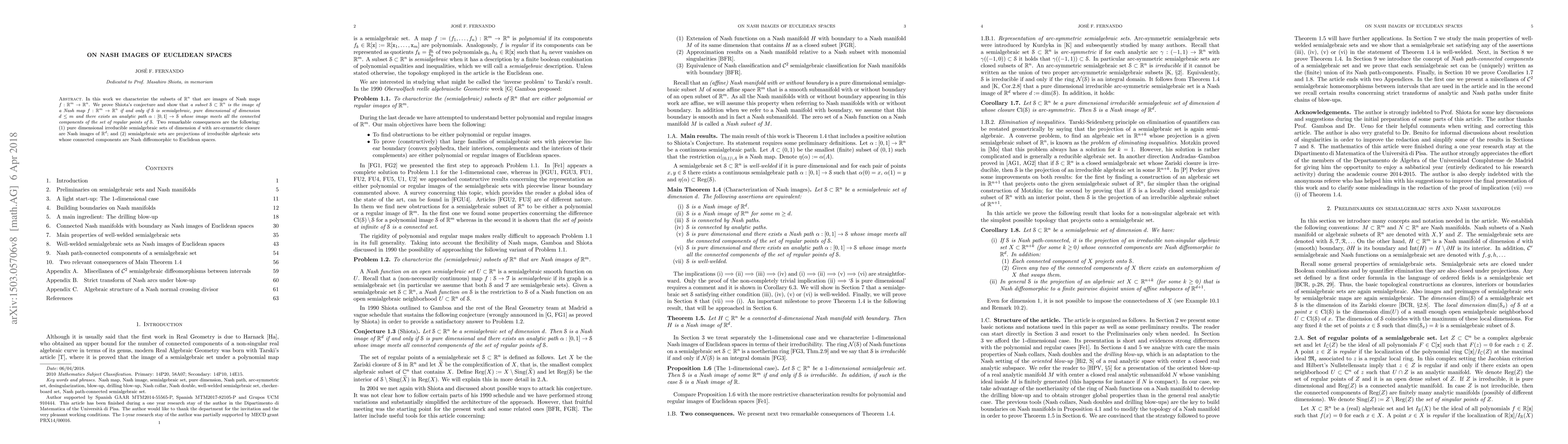 This paper characterizes subsets of ${\mathbb R}^n$ that are images of Nash maps from ${\mathbb R}^m$, proving Shiota's conjecture that such subsets are semialgebraic, pure dimensional, and have analytic paths intersecting all regular point components. It also establishes connections to irreducible semialgebraic sets and smooth manifolds.
