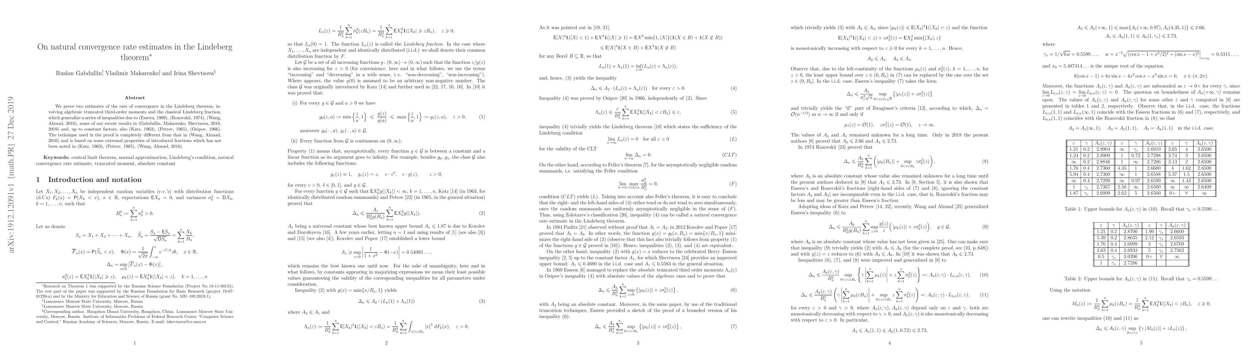 This research paper proves two estimates of convergence rate in the Lindeberg theorem, generalizing previous inequalities with a new proof technique based on extremal properties of introduced fractions.