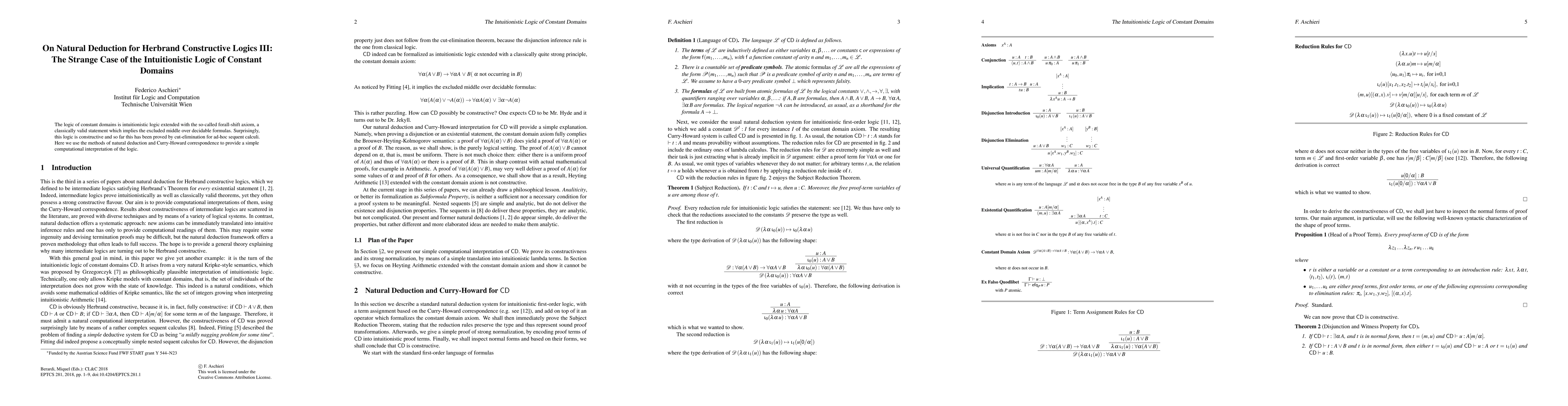 This paper explores the intuitionistic logic of constant domains, which extends intuitionistic logic with the forall-shift axiom, and demonstrates its constructive nature using natural deduction and the Curry-Howard correspondence, providing a straightforward computational interpretation.
