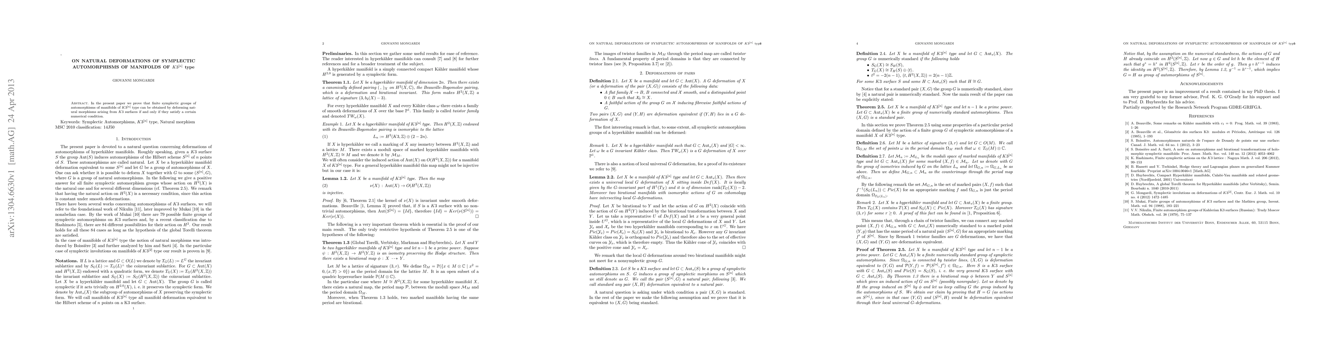 Summary: This paper demonstrates that finite symplectic automorphism groups of K3^[n] manifolds can be derived from natural deformations of K3 surface morphisms, provided they meet a specific numerical criterion.