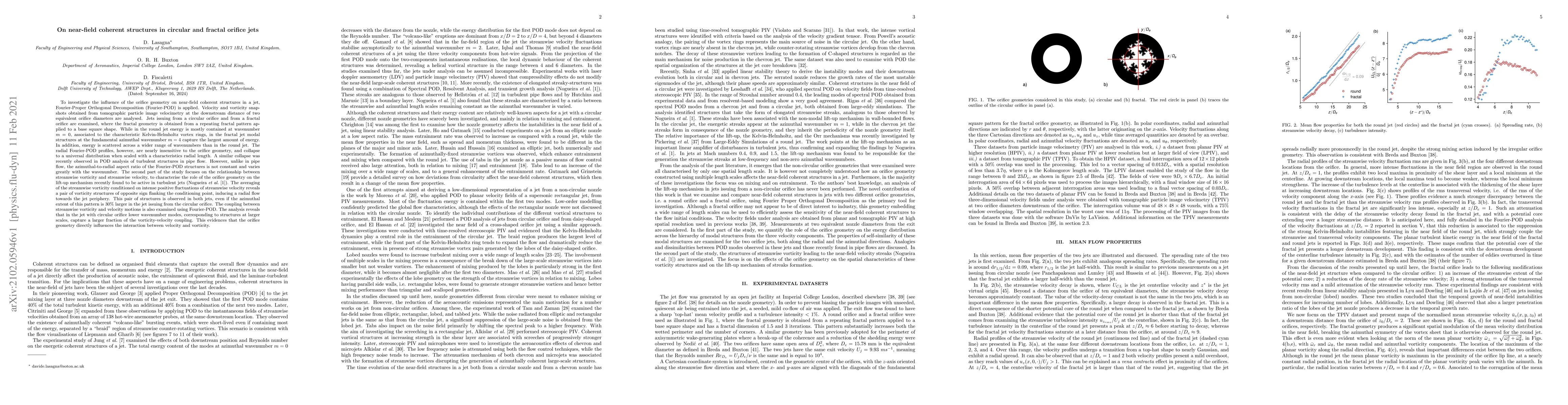 To investigate the influence of the orifice geometry on near-field coherent structures in a jet, Fourier-POD is applied. Velocity and vorticity snapshots obtained from tomographic particle image velocimetry at the downstream distance of two equivalent orifice diameters are analysed. Jets issuing from a circular orifice and from a fractal orifice are examined, where the fractal geometry is obtained from a repeating fractal pattern applied to a base square shape. While in the round jet energy is mostly contained at wavenumber m=0, associated to the characteristic Kelvin-Helmholtz vortex rings, in the fractal jet modal structures at the fundamental azimuthal wavenumber m=4 capture the largest amount of energy. The second part of the study focuses on the relationship between streamwise vorticity and streamwise velocity, to characterise the role of the orifice geometry on the lift-up mechanism recently found to be active in turbulent jets. The averaging of the streamwise vorticity conditioned on intense positive fluctuations of streamwise velocity reveals a pair of vorticity structures of opposite sign flanking the conditioning point, inducing a radial flow towards the jet periphery. This pair of structures is observed in both jets, even if the azimuthal extent of this pattern is 30% larger in the jet issuing from the circular orifice. This evidences that the orifice geometry directly influences the interaction between velocity and vorticity.