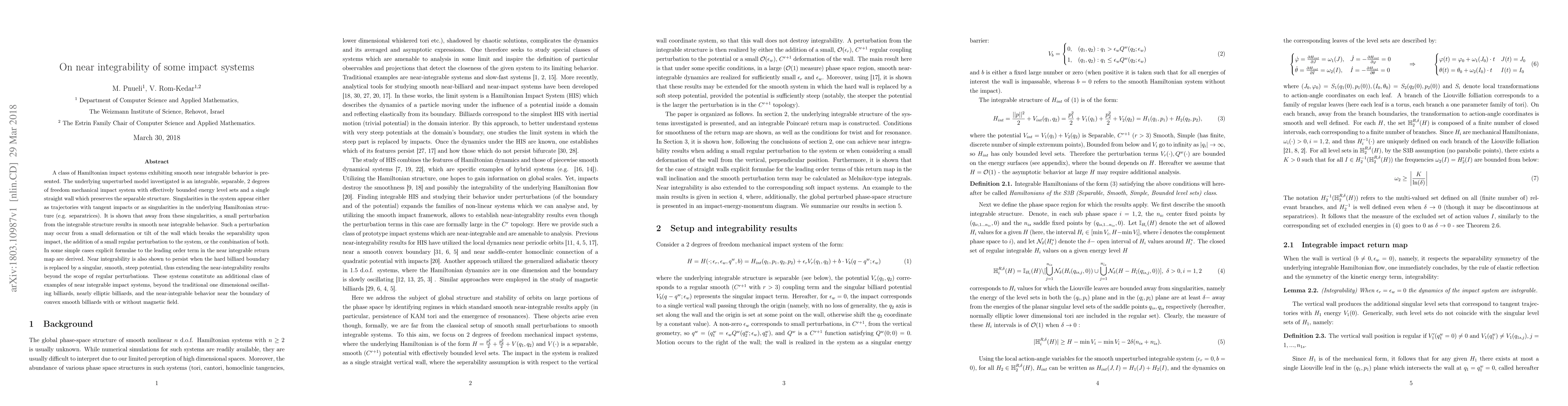 This paper explores Hamiltonian impact systems that exhibit smooth near integrable behavior despite perturbations. It investigates a separable, 2-degree-of-freedom mechanical system with a single straight wall, showing that small perturbations maintain near integrable dynamics away from singularities, extending the concept beyond traditional billiard systems.