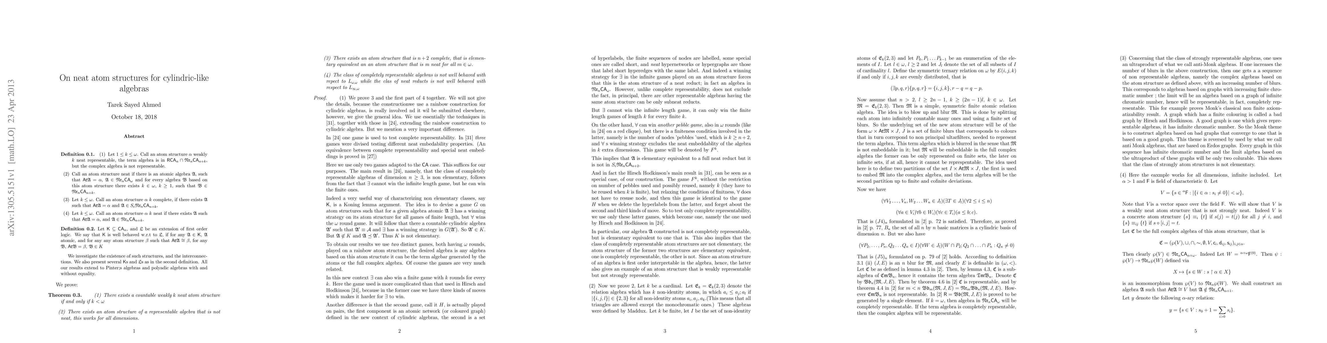 This research paper investigates the existence of neat atom structures in cylindric algebras, exploring their properties and connections to other algebraic systems.