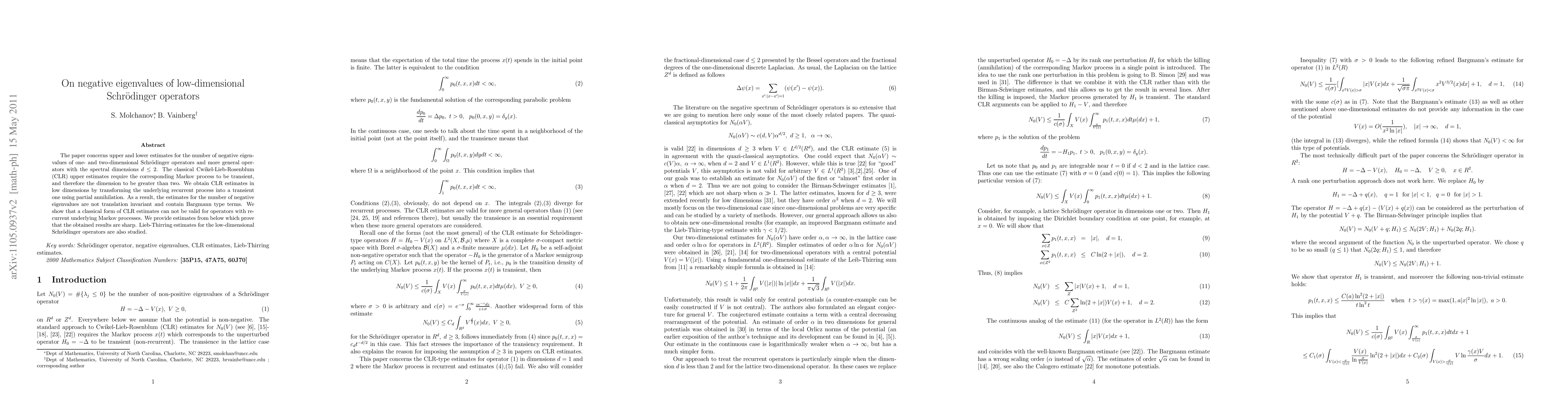 This paper investigates the number of negative eigenvalues for low-dimensional Schrödinger operators, deriving upper and lower bounds that apply even when the underlying Markov process is recurrent. It transforms recurrent processes into transient ones using partial annihilation, providing non-translation invariant estimates with Bargmann terms.