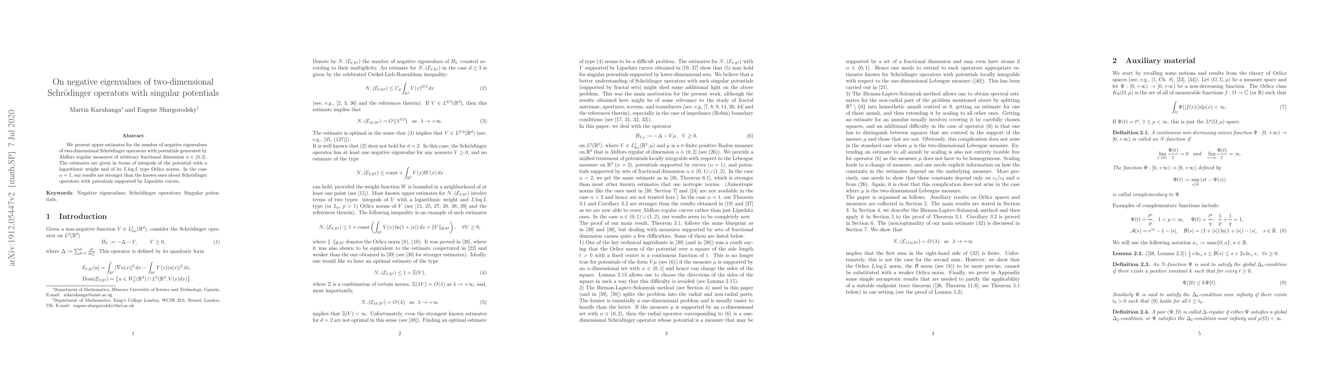 Summary: This paper provides upper bounds for the number of negative eigenvalues in two-dimensional Schrödinger operators with singular potentials derived from Ahlfors regular measures. The estimates are expressed in terms of potential integrals with logarithmic weights and L log L norms, with stronger results for potentials supported by Lipschitz curves when the dimension is one.