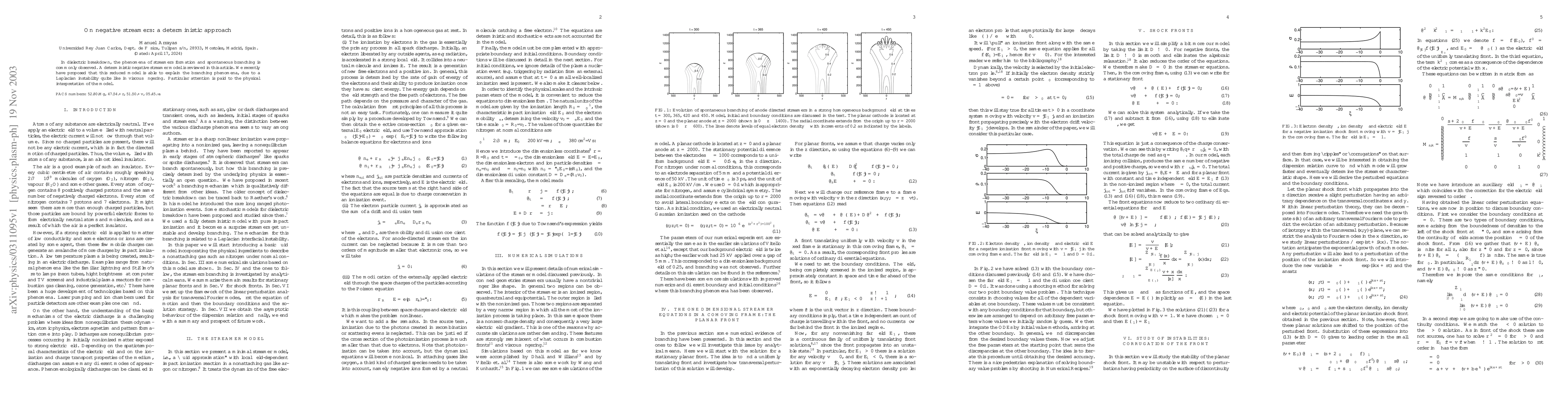 In dielectric breakdown, the phenomena of streamers formation and spontaneous branching is commonly observed. A deterministic negative streamer model is reviewed in this article. We recently have proposed that this reduced model is able to explain the branching phenomena, due to a Laplacian instability quite like in viscous fingering. Particular attention is paid to the physical interpretation of the model.