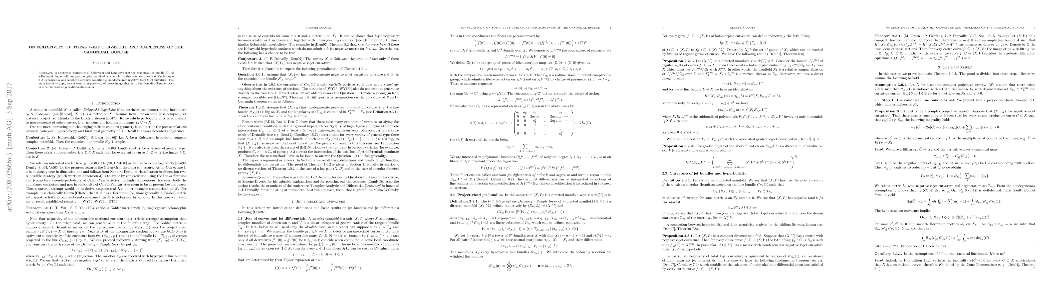 A celebrated conjecture of Kobayashi and Lang says that the canonical line bundle $K_X$ of a Kobayashi hyperbolic compact complex manifold $X$ is ample. In this note we prove that $K_X$ is ample if $X$ is projective and satisfies a stronger condition of nondegenerate negative total $k$-jet curvature. We use positivity of direct image sheaves and decomposition of jets in order to produce pluridifferentials on $X$.