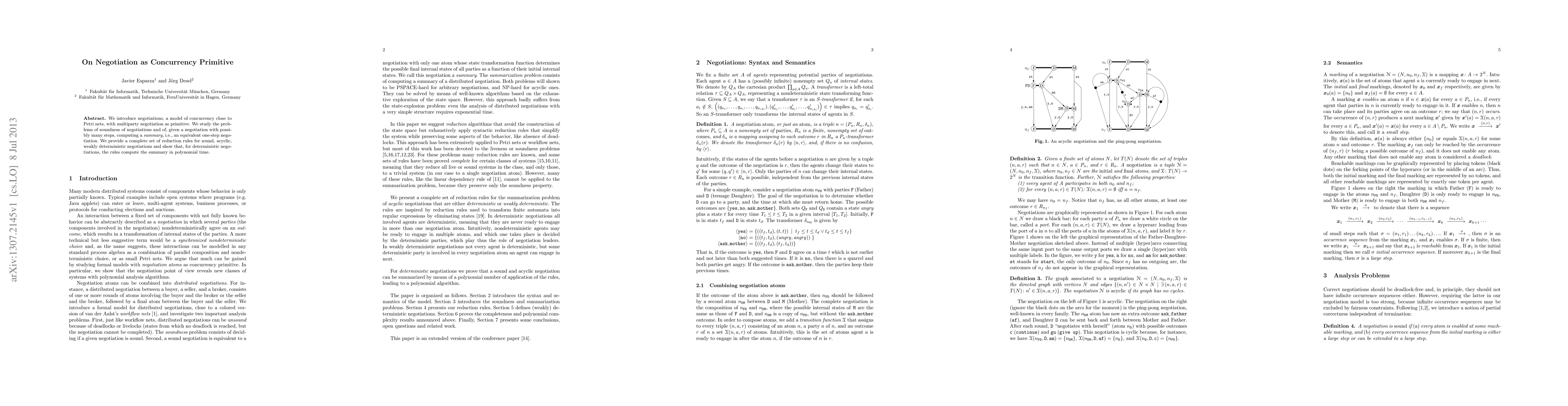 This paper proposes a concurrency model called "negotiations," which uses multiparty negotiation as a primitive akin to Petri nets. It explores soundness issues and the computation of summaries for complex negotiations, providing reduction rules that efficiently compute summaries in polynomial time for deterministic negotiations.