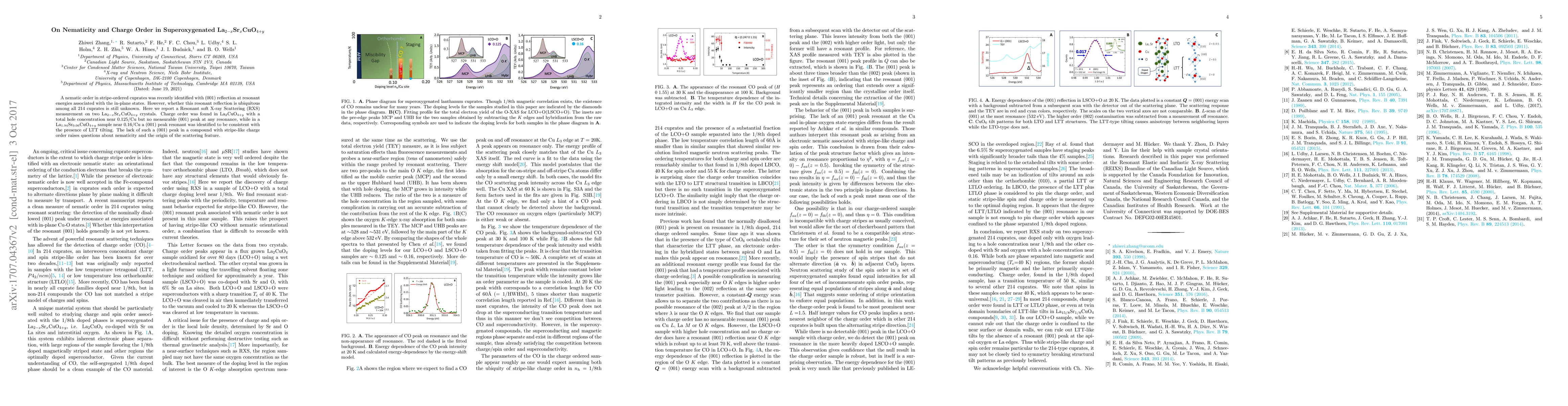 This study employs Resonant soft X-ray Scattering (RXS) to investigate nematicity and charge order in two La$_{2-x}$Sr$_x$CuO$_{4+y}$ samples. While charge order is observed in both, only the La$_{1.94}$Sr$_{0.06}$CuO$_{4+y}$ sample shows a (001) peak, raising questions about the universality of nematic order in cuprates.