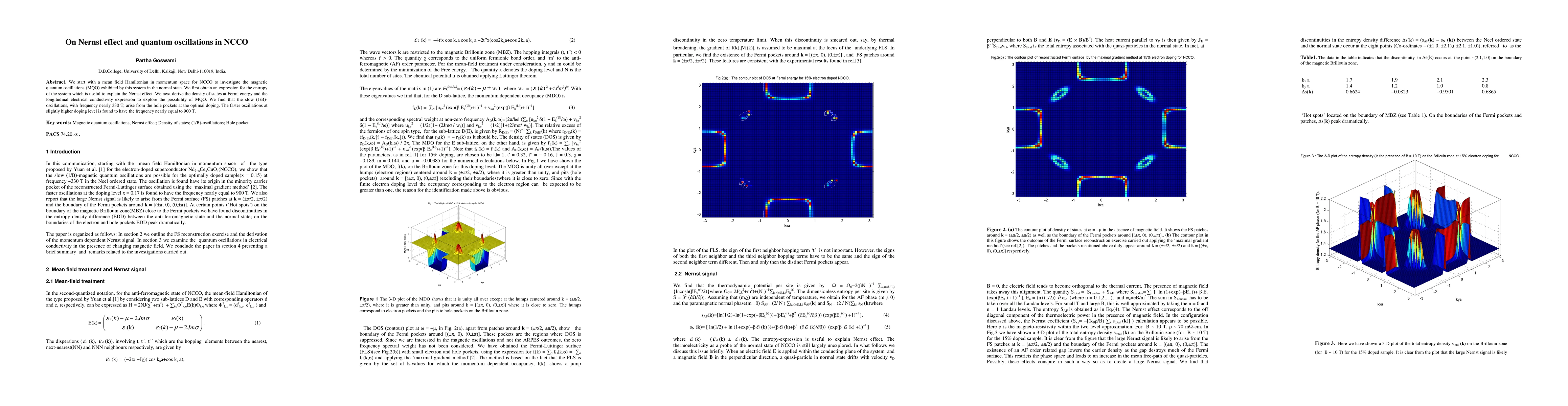 We start with a mean field Hamiltonian in momentum space for NCCO to investigate the magnetic quantum oscillations (MQO) exhibited by this system in the normal state. We first obtain an expression for the entropy of the system which is useful to explain the Nernst effect. We next derive the density of states at Fermi energy and the longitudinal electrical conductivity expression to explore the possibility of MQO. We find that the slow (1/B)-oscillations, with frequency nearly 330 T, arise from the hole pockets at the optimal doping. The faster oscillations at slightly higher doping level is found to have the frequency nearly equal to 900 T.