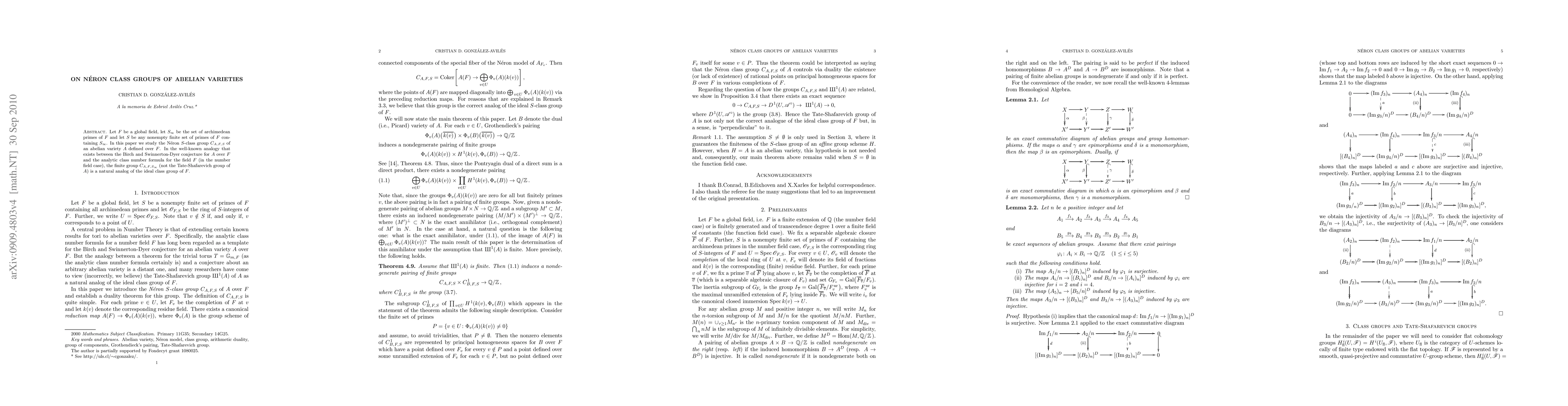 Let F be a global field and let S denote a nonempty finite set of primes of F containing the set S' of archimedean primes of F. In this paper we study the Neron S-class group C_{A,F,S} of an abelian variety A defined over F. In the well-known analogy that exists between the Birch and Swinnerton-Dyer conjecture for A over F and Dirichlet's analytic class number formula for the field F (in the number field case), the finite group C_{A,F,S'} (not the Tate-Shafarevich group of A) is a natural analog of the ideal class group of F.
