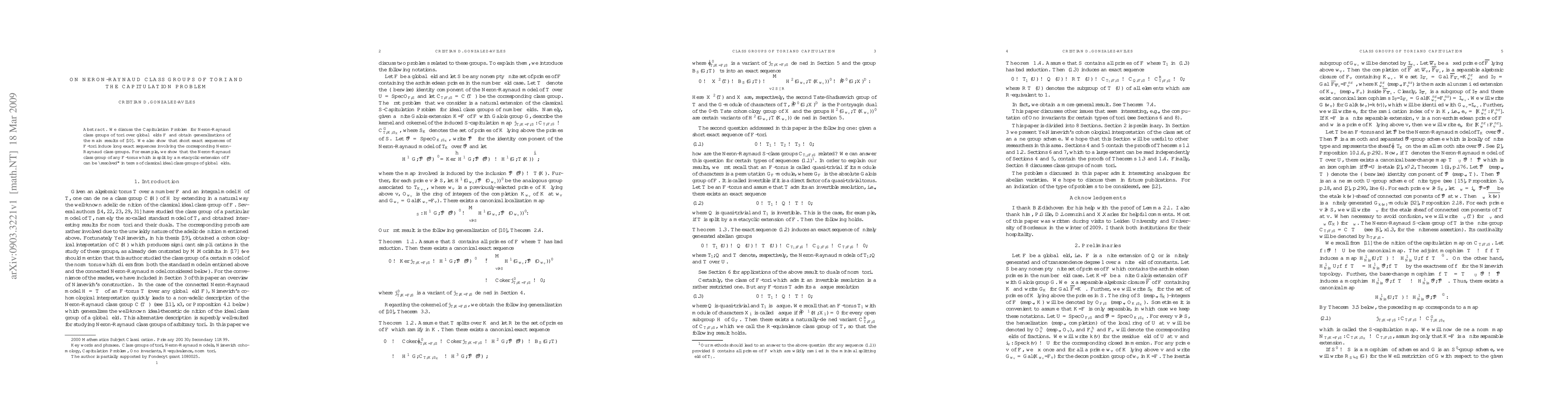 This paper generalizes the Capitulation Problem for Neron-Raynaud class groups of tori over global fields, demonstrating that short exact sequences of tori induce long exact sequences in their corresponding class groups. It also resolves the Neron-Raynaud class group of split F-tori in terms of classical ideal class groups.