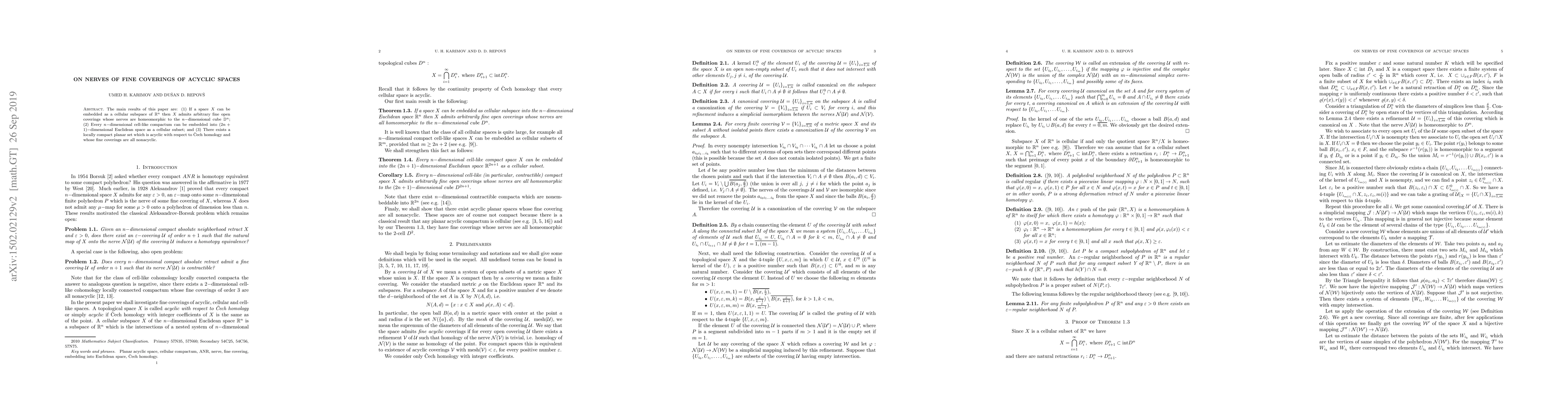 This paper demonstrates that acyclic spaces embedded in $\mathbb{R}^n$ have fine open coverings with nerve homeomorphic to $\mathbb{D}^n$, and establishes embeddings of $n$-dimensional cell-like compacta into $(2n+1)$-dimensional Euclidean space. It also introduces a locally compact acyclic planar set with nonacyclic fine coverings.
