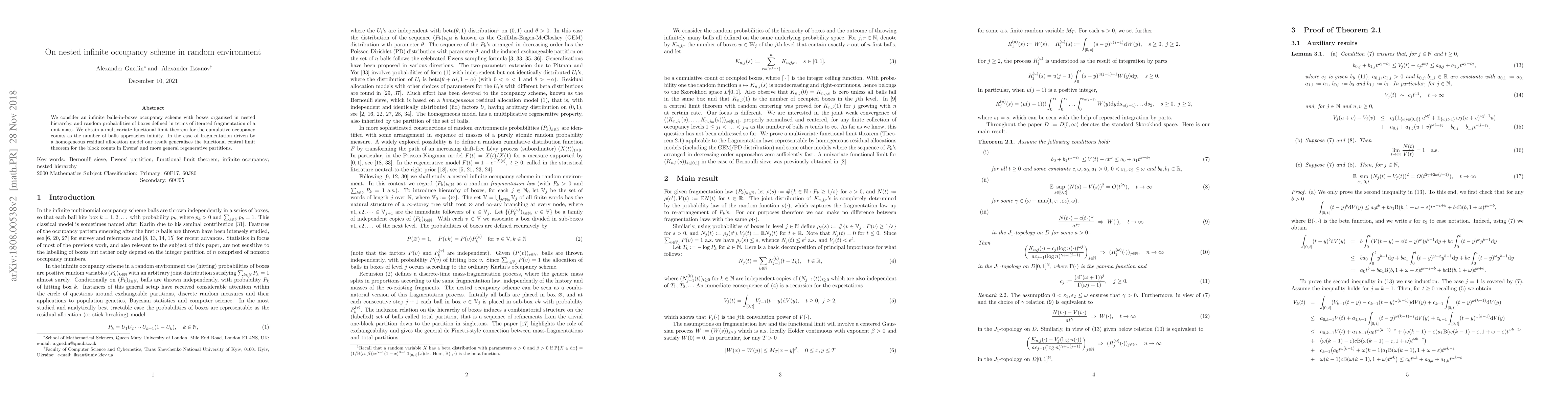 This paper studies an infinite occupancy scheme where boxes are nested hierarchically and have random probabilities, derived from iterated fragmentation of a unit mass. It establishes a multivariate functional limit theorem for cumulative occupancy counts, generalizing the functional central limit theorem for block counts in Ewens' and regenerative partitions.