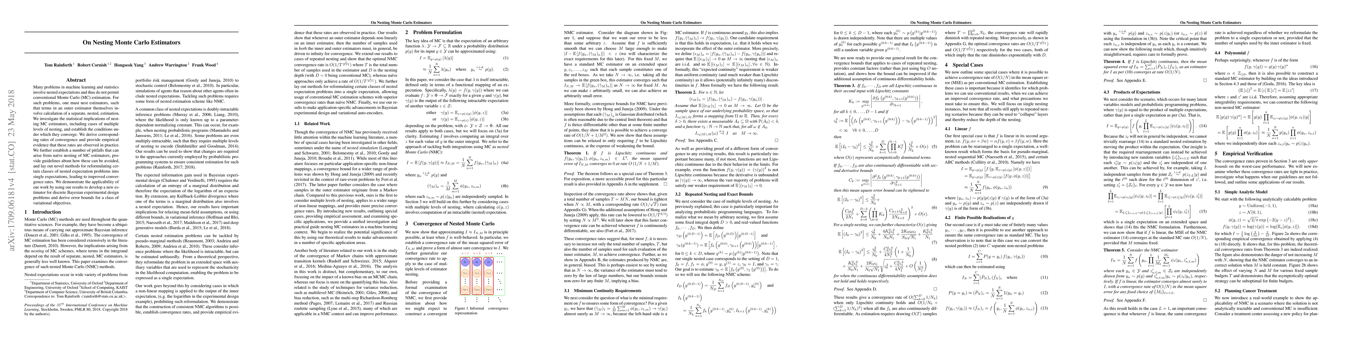 Many problems in machine learning and statistics involve nested expectations and thus do not permit conventional Monte Carlo (MC) estimation. For such problems, one must nest estimators, such that terms in an outer estimator themselves involve calculation of a separate, nested, estimation. We investigate the statistical implications of nesting MC estimators, including cases of multiple levels of nesting, and establish the conditions under which they converge. We derive corresponding rates of convergence and provide empirical evidence that these rates are observed in practice. We further establish a number of pitfalls that can arise from naive nesting of MC estimators, provide guidelines about how these can be avoided, and lay out novel methods for reformulating certain classes of nested expectation problems into single expectations, leading to improved convergence rates. We demonstrate the applicability of our work by using our results to develop a new estimator for discrete Bayesian experimental design problems and derive error bounds for a class of variational objectives.