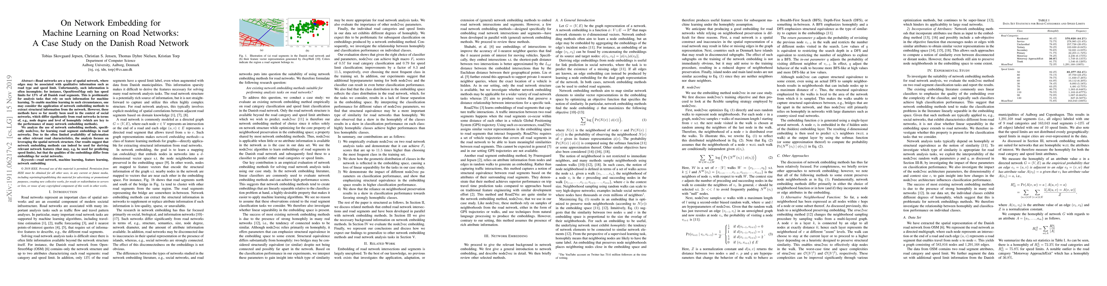 This paper explores the application of network embedding methods, particularly node2vec, to extract structural information from road networks, focusing on the Danish road network where qualitative data is incomplete. The study finds that while network embeddings can provide useful features for machine learning tasks, their effectiveness varies compared to embeddings used in social networks due to the unique characteristics of road networks.