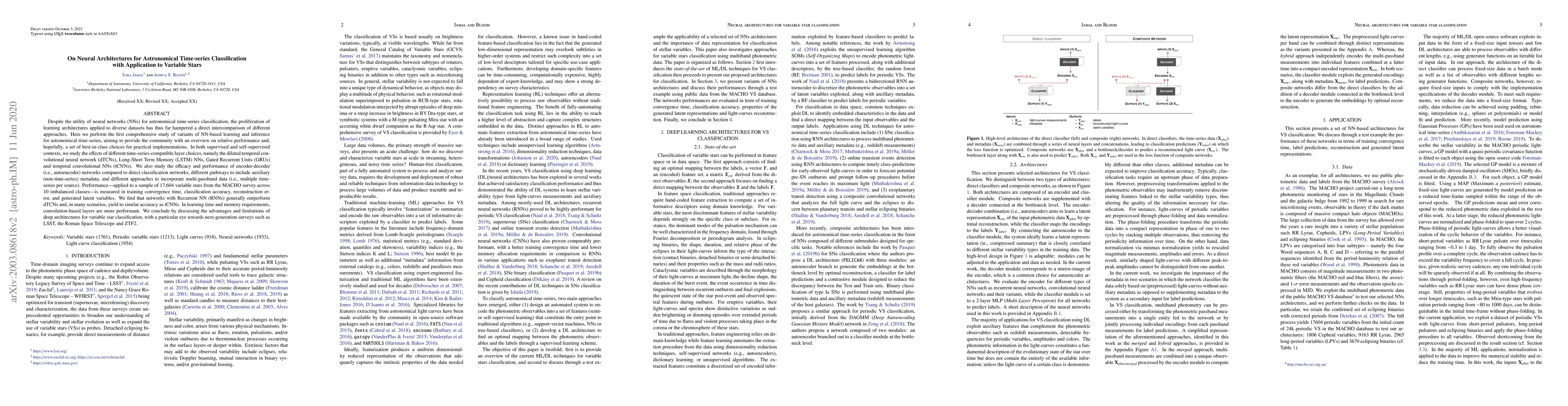 This paper conducts a comprehensive study of neural network architectures for classifying astronomical time-series data, focusing on variable stars. It compares various deep learning models, including RNNs, dTCNs, LSTMs, GRUs, and tCNNs, assessing their performance in terms of accuracy, training time, and memory usage. The study concludes that RNNs often outperform convolutional networks in accuracy but are less efficient in terms of learning time and memory.