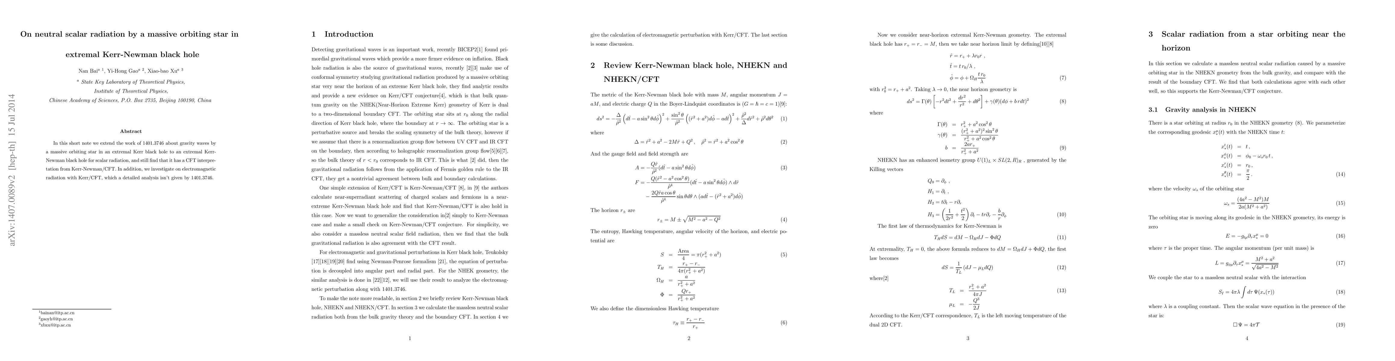 In this short note we extend the work of 1401.3746 about gravity waves by a massive orbiting star in an extremal Kerr black hole to an extremal Kerr- Newman black hole for scalar radiation, and still find that it has a CFT interpretation from Kerr-Newman/CFT. In addition, we investigate on electromagnetic radiation with Kerr/CFT, which a detailed analysis isn't given by 1401.3746.