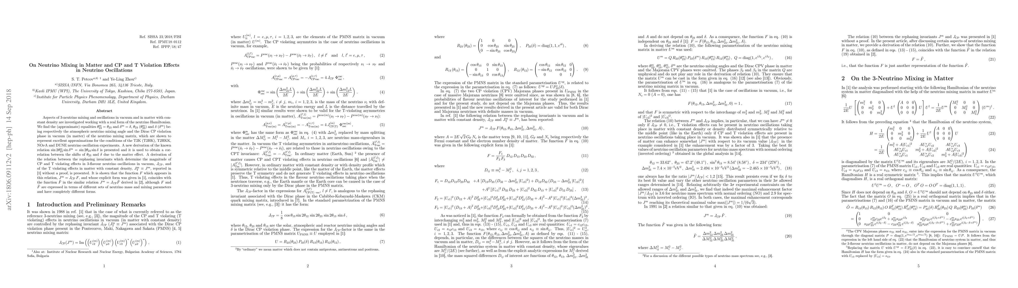Aspects of 3-neutrino mixing and oscillations in vacuum and in matter with constant density are investigated working with a real form of the neutrino Hamiltonian. We find the (approximate) equalities $\theta^m_{23} = \theta_{23}$ and $\delta^m = \delta$, $\theta_{23}$ ($\theta^m_{23}$) and $\delta$ ($\delta^m$) being respectively the atmospheric neutrino mixing angle and the Dirac CP violation phase in vacuum (in matter) of the neutrino mixing matrix, which are shown to represent excellent approximations for the conditions of the T2K (T2HK), T2HKK, NO$\nu$A and DUNE neutrino oscillation experiments. A new derivation of the known relation $\sin2\theta^m_{23} \sin\delta^m = \sin2\theta_{23} \sin\delta$ is presented and it is used to obtain a correlation between the shifts of $\theta_{23}$ and $\delta$ due to the matter effect. A derivation of the relation between the rephasing invariants which determine the magnitude of CP and T violating effects in 3-flavour neutrino oscillations in vacuum, $J_{\rm CP}$, and of the T violating effects in matter with constant density, $J^{m}_{\rm T} \equiv J^{m}$, reported in \cite{Krastev:1988yu} without a proof, is presented. It is shown that the function $F$ which appears in this relation, $J^{m} = J_{\rm CP}\,F$, and whose explicit form was given in \cite{Krastev:1988yu}, coincides with the function $\tilde{F}$ in the similar relation $J^{m} = J_{\rm CP}\tilde{F}$ derived in \cite{Naumov:1991ju}, although $F$ and $\tilde{F}$ are expressed in terms of different sets of neutrino mass and mixing parameters and have completely different forms.