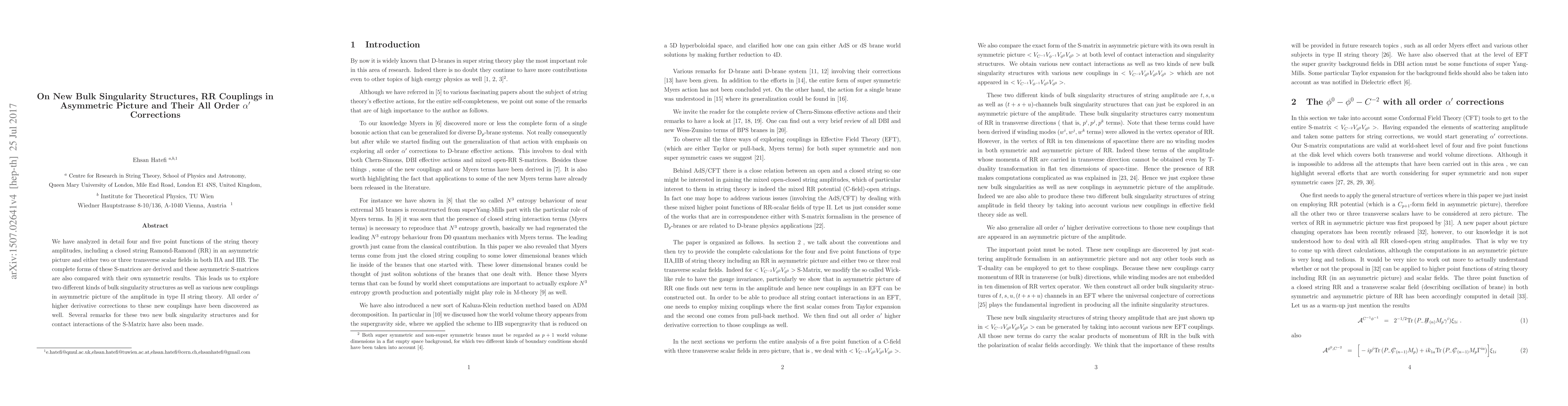 We have analyzed in detail four and five point functions of the string theory amplitudes, including a closed string Ramond-Ramond (RR) in an asymmetric picture and either two or three transverse scalar fields in both IIA and IIB. The complete forms of these S-matrices are derived and these asymmetric S-matrices are also compared with their own symmetric results. This leads us to explore two different kinds of bulk singularity structures as well as various new couplings in asymmetric picture of the amplitude in type II string theory. All order $\alpha'$ higher derivative corrections to these new couplings have been discovered as well. Several remarks for these two new bulk singularity structures and for contact interactions of the S-Matrix have also been made.