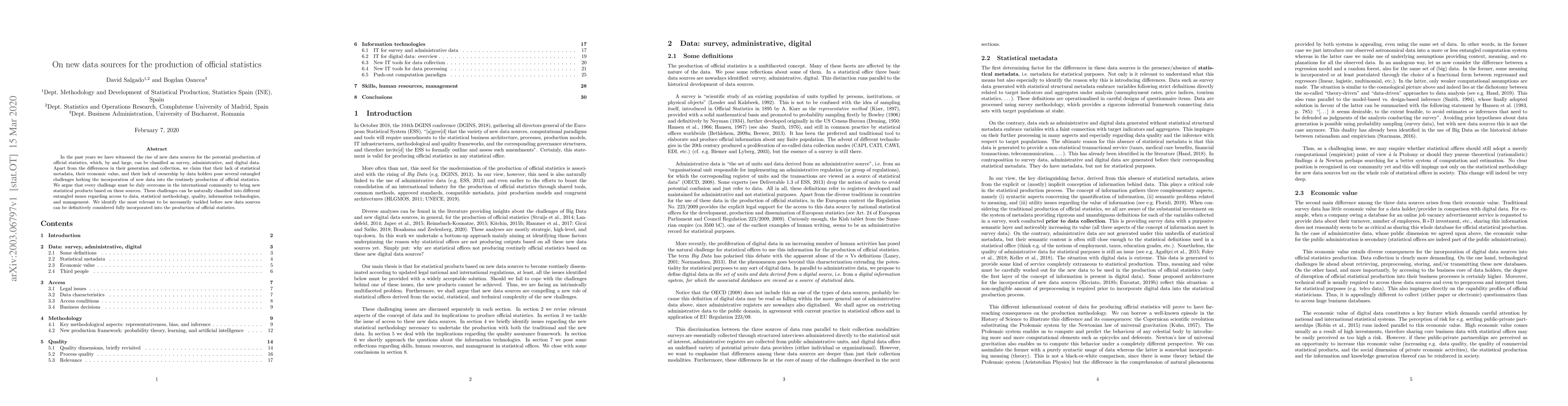 In the past years we have witnessed the rise of new data sources for the potential production of official statistics, which, by and large, can be classified as survey, administrative, and digital data. Apart from the differences in their generation and collection, we claim that their lack of statistical metadata, their economic value, and their lack of ownership by data holders pose several entangled challenges lurking the incorporation of new data into the routinely production of official statistics. We argue that every challenge must be duly overcome in the international community to bring new statistical products based on these sources. These challenges can be naturally classified into different entangled issues regarding access to data, statistical methodology, quality, information technologies, and management. We identify the most relevant to be necessarily tackled before new data sources can be definitively considered fully incorporated into the production of official statistics.