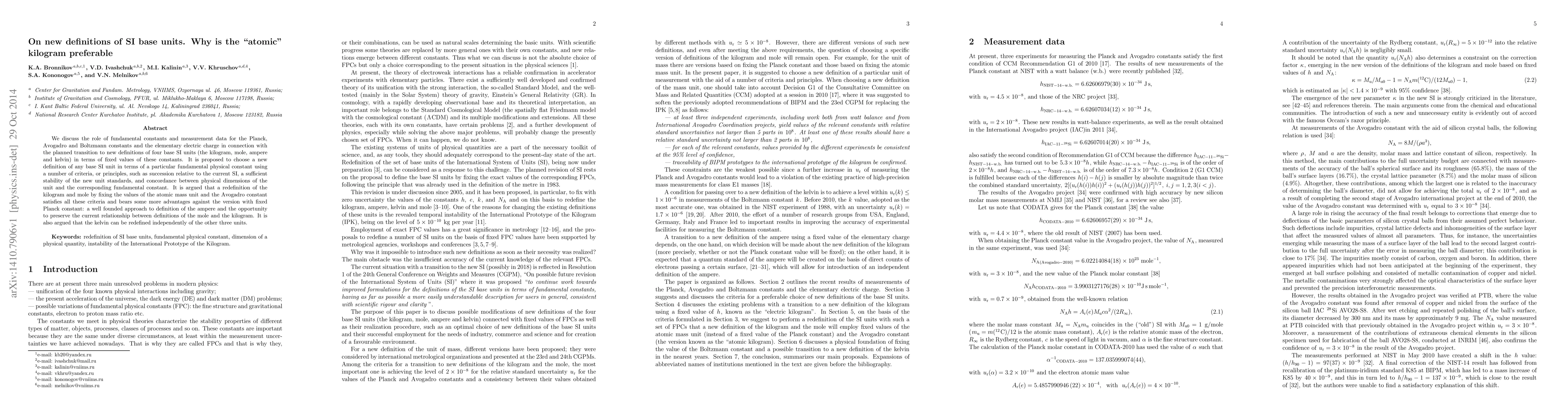 We discuss the role of fundamental constants and measurement data for the Planck, Avogadro and Boltzmann constants and the elementary electric charge in connection with the planned transition to new definitions of four base SI units (the kilogram, mole, ampere and kelvin) in terms of fixed values of these constants. It is proposed to choose a new definition of any base SI unit in terms of a particular fundamental physical constant using a number of criteria, or principles, such as succession relative to the current SI, a sufficient stability of the new unit standards, and concordance between physical dimensions of the unit and the corresponding fundamental constant. It is argued that a redefinition of the kilogram and mole by fixing the values of the atomic mass unit and the Avogadro constant satisfies all these criteria and bears some more advantages against the version with fixed Planck constant: a well founded approach to definition of the ampere and the opportunity to preserve the current relationship between definitions of the mole and the kilogram. It is also argued that the kelvin can be redefined independently of the other three units.