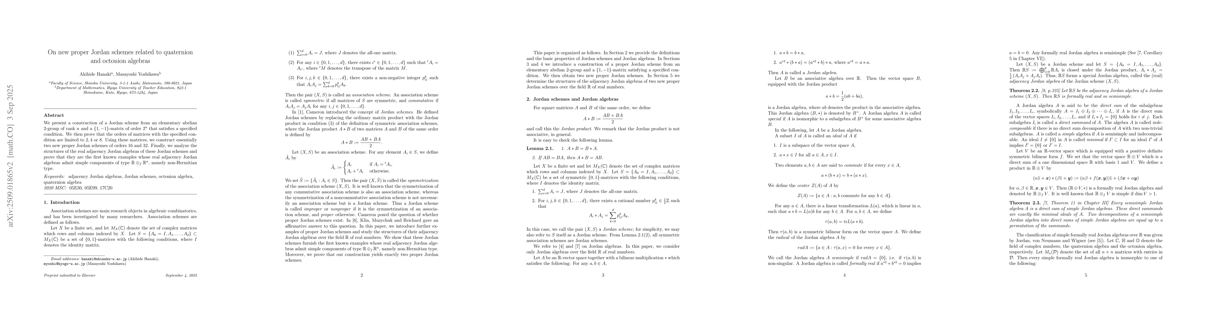 We present a construction of a Jordan scheme from an elementary abelian $2$-group of rank $n$ and a $\{1,-1\}$-matrix of order $2^n$ that satisfies a specified condition. We then prove that the orders of matrices with the specified condition are limited to $2, 4$ or $8$. Using these matrices, we construct essentially two new proper Jordan schemes of orders $16$ and $32$. Finally, we analyze the structures of the real adjacency Jordan algebras of these Jordan schemes and prove that they are the first known examples whose real adjacency Jordan algebras admit simple components of type $\mathbb{R} \oplus_f \mathbb{R}^n$, namely non-Hermitian type.