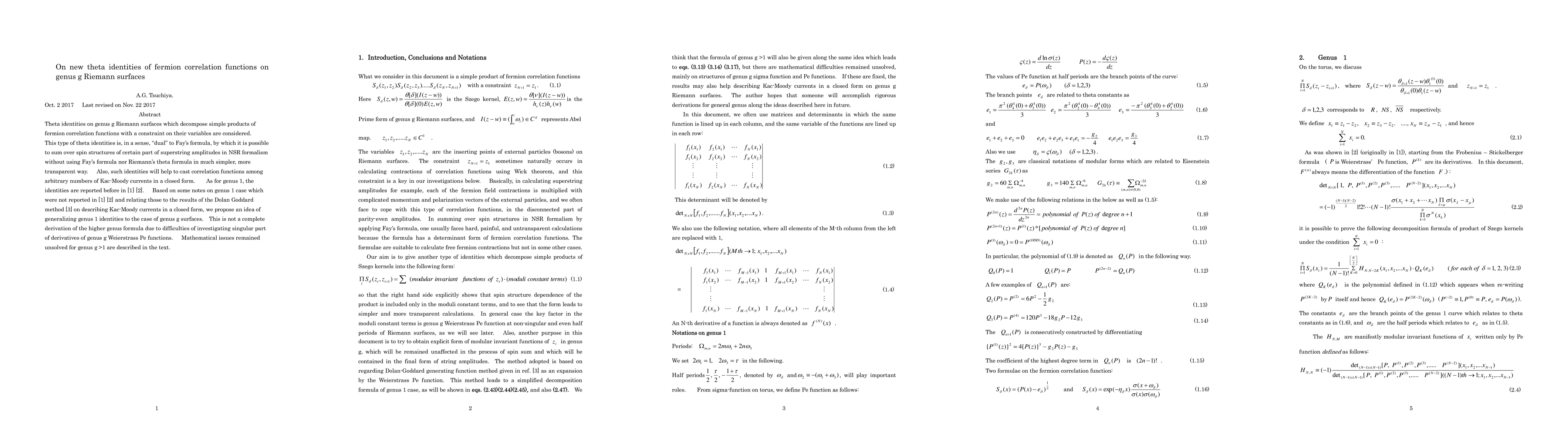 Theta identities on genus g Riemann surfaces which decompose simple products of fermion correlation functions with a constraint on their variables are considered. This type of theta identities is, in a sense, dual to Fay s formula, by which it is possible to sum over spin structures of certain part of superstring amplitudes in NSR formalism without using Fay s formula nor Riemann s theta formula in much simpler, more transparent way. Also, such identities will help to cast correlation functions among arbitrary numbers of Kac-Moody currents in a closed form. As for genus 1, the identities are reported before in ref[1] [2]. Based on some notes on genus 1 case which were not reported in ref[1] [2] and relating those to the results of the Dolan Goddard method ref[3] on describing Kac-Moody currents in a closed form, we propose an idea of generalizing genus 1 identities to the case of genus g surfaces. This is not a complete derivation of the higher genus formula due to difficulties of investigating singular part of derivatives of genus g Weierstrass Pe functions. Mathematical issues remained unsolved for genus g >1 are described in the text.