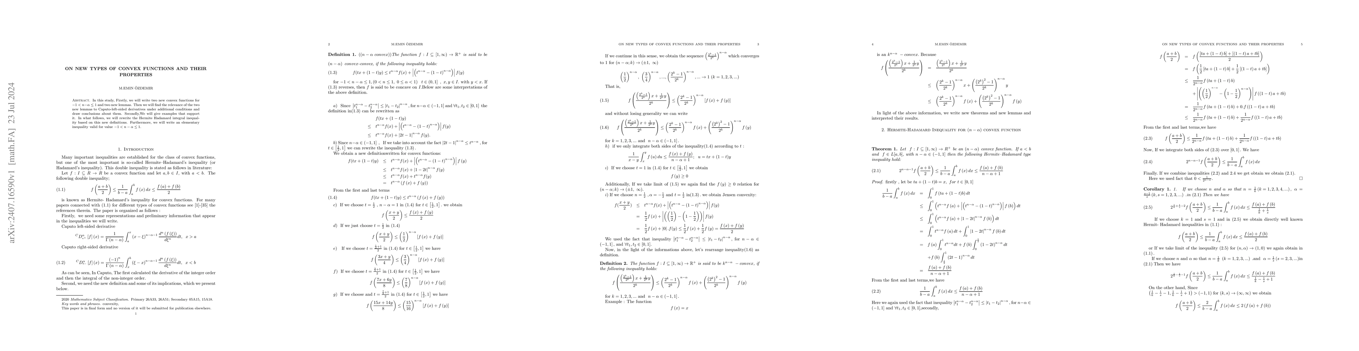 This paper introduces two new convex functions and associated lemmas, exploring their connection to Caputo-left-sided derivatives. It also provides examples to support the findings and rewrites the Hermite Hadamard integral inequality based on these new definitions, concluding with an elementary inequality for specified parameter ranges.