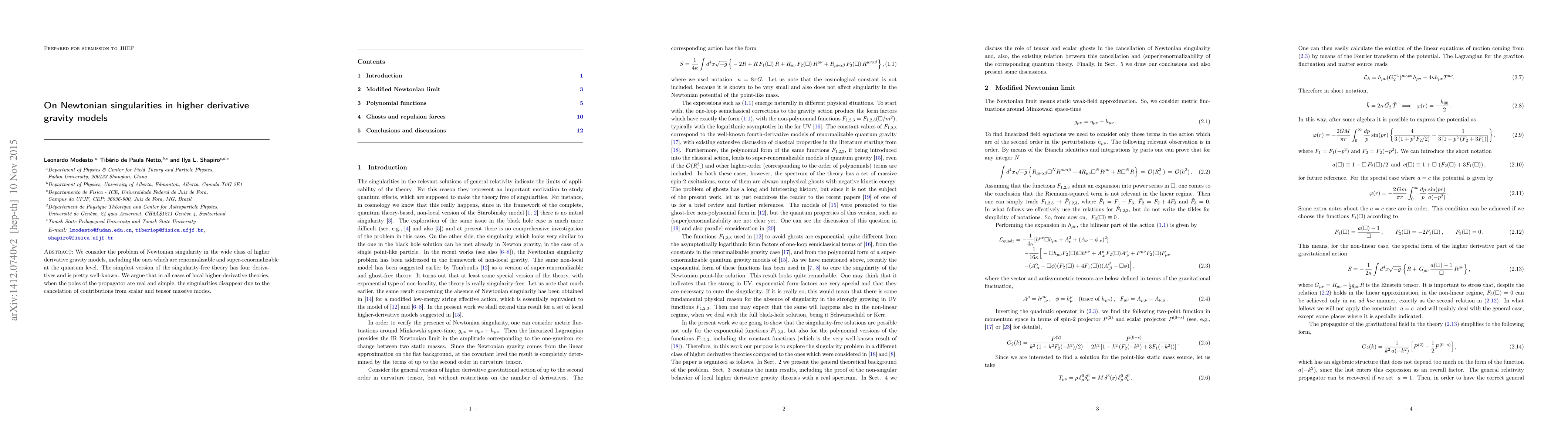 This paper investigates Newtonian singularities in various higher derivative gravity models, demonstrating that singularities vanish when the propagator's poles are real and simple, due to the cancellation of contributions from scalar and tensor massive modes. The simplest singularity-free theory involves four derivatives.