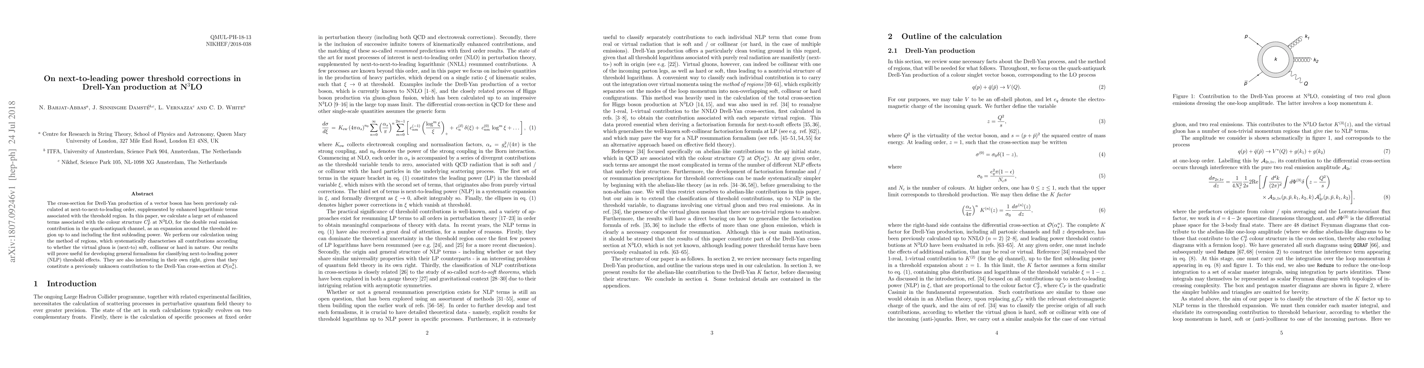 This paper calculates next-to-leading power threshold corrections at N$^3$LO for Drell-Yan production, focusing on the colour structure $C_F^3$ in the quark-antiquark channel. The method of regions is employed to systematically categorize contributions from soft, collinear, and hard virtual gluons, providing new insights into the Drell-Yan cross-section.