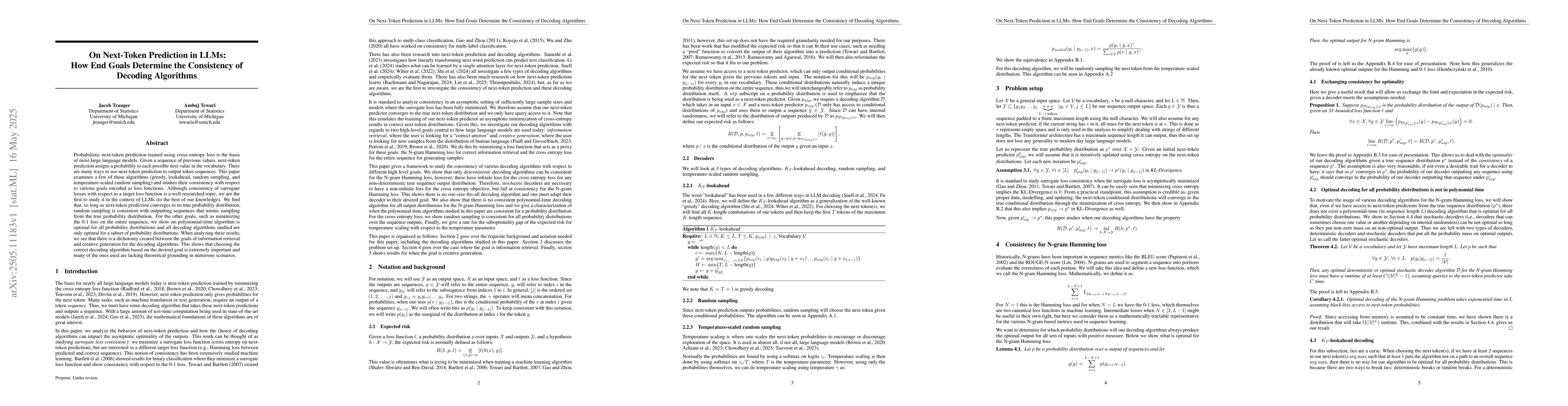 The paper examines various decoding algorithms (greedy, lookahead, random sampling, and temperature-scaled random sampling) for next-token prediction in language models, analyzing their consistency with respect to different end goals encoded as loss functions.