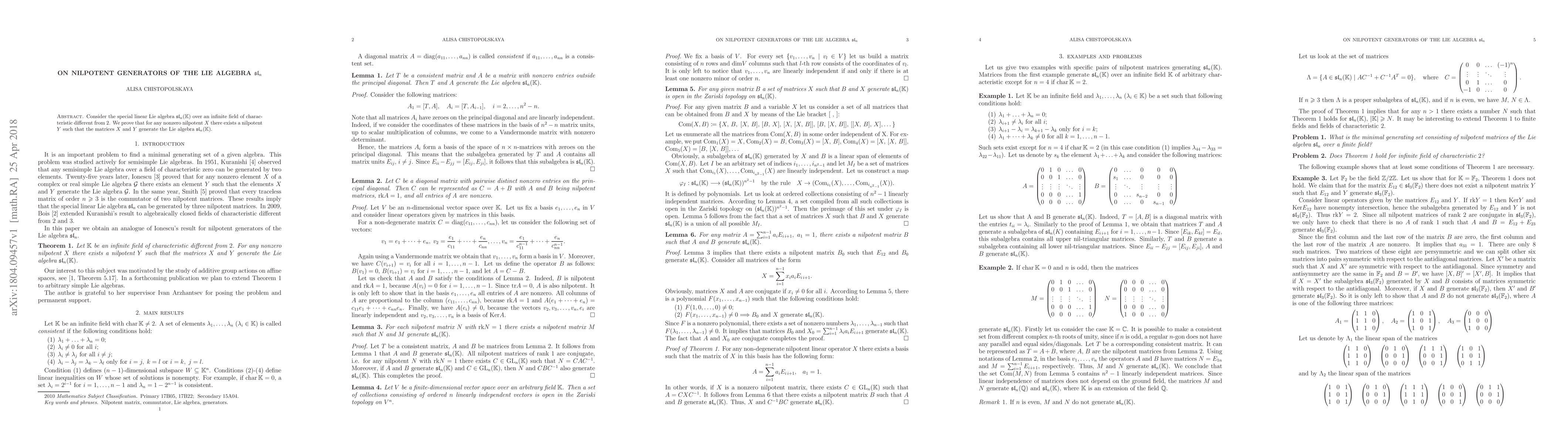 Summary: This paper proves that for any nonzero nilpotent matrix $X$ in the special linear Lie algebra $\mathfrak{sl}_n(\mathbb {K})$ over an infinite field of characteristic different from $2$, there exists another nilpotent matrix $Y$ that, together with $X$, generates the entire $\mathfrak{sl}_n(\mathbb {K})$.