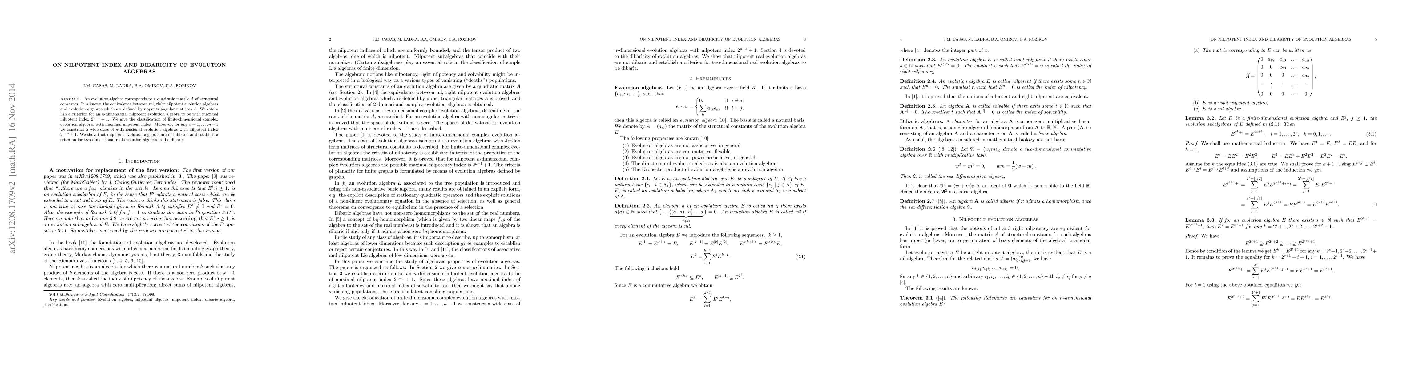 The paper presents a detailed classification and criteria for the nilpotent index and dibaricity of evolution algebras, extending previous work on their structural properties.