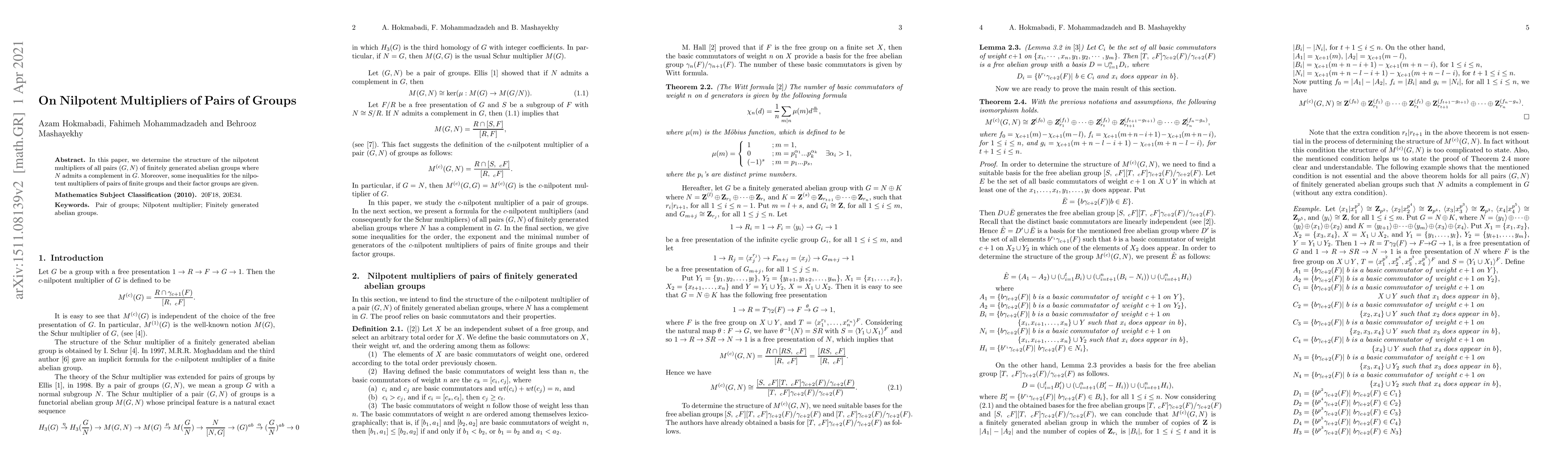 This paper determines the structure of nilpotent multipliers for pairs of finitely generated abelian groups where one group is a complement of the other, and provides inequalities for nilpotent multipliers in pairs of finite groups and their factor groups.
