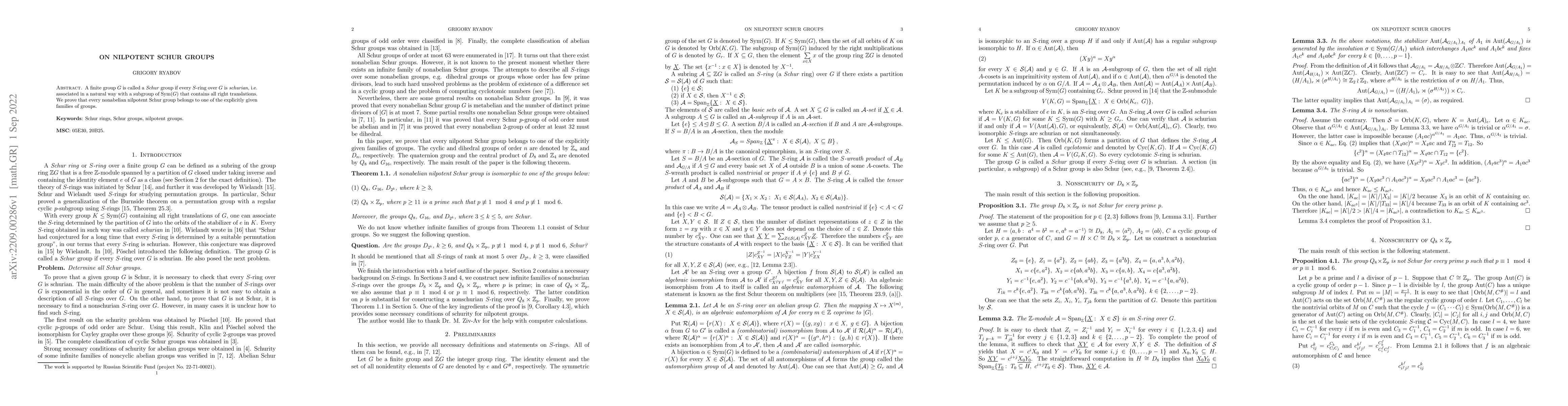 Summary: This paper proves that every nonabelian nilpotent Schur group falls into one of several explicitly defined families, providing a classification for these groups. The study focuses on the structural properties of Schur groups within the context of nilpotency and permutation representations.