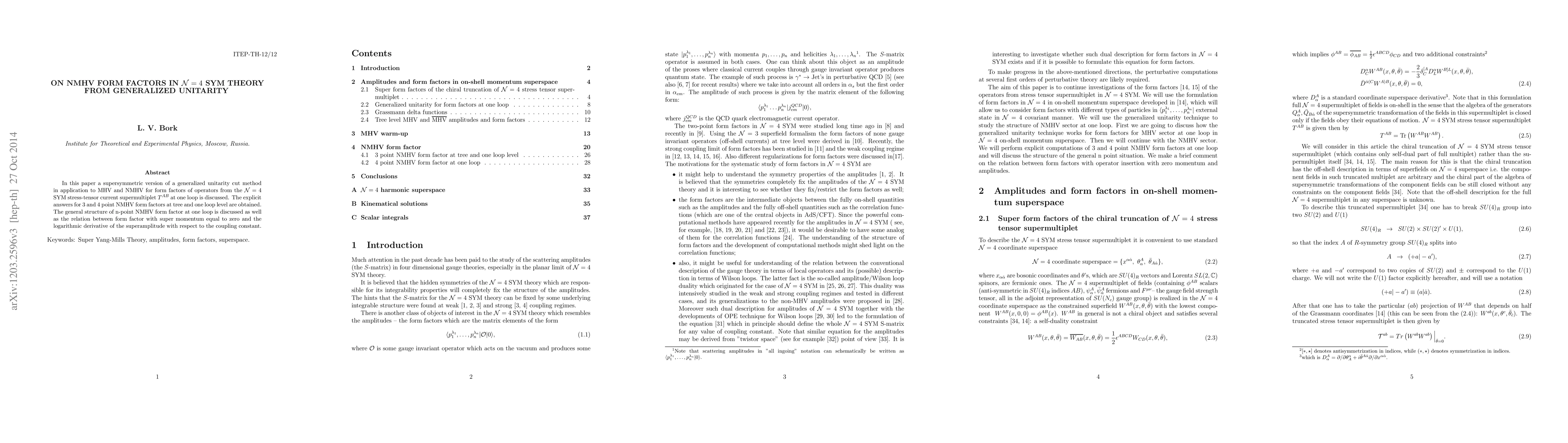 In this paper a supersymmetric version of a generalized unitarity cut method in application to MHV and NMHV for form factors of operators from the N=4 SYM stress-tensor current supermultiplet $T^{AB}$ at one loop is discussed. The explicit answers for 3 and 4 point NMHV form factors at tree and one loop level are obtained. The general structure of n-point NMHV form factor at one loop is discussed as well as the relation between form factor with super momentum equal to zero and the logarithmic derivative of the superamplitude with respect to the coupling constant.