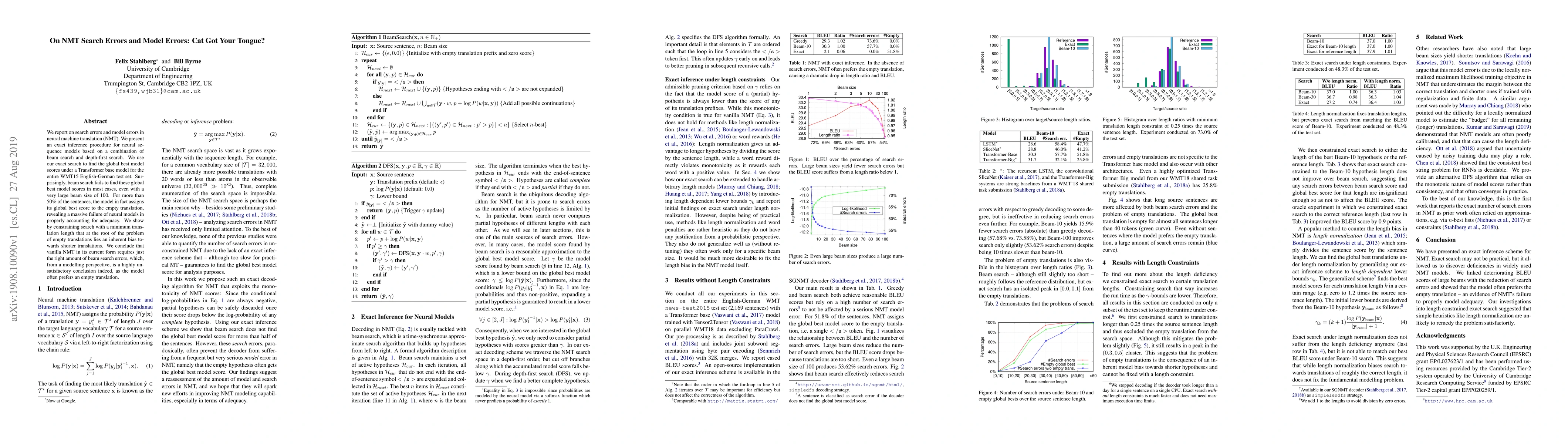 The paper presents an exact inference procedure for neural sequence models using a combination of beam search and depth-first search (DFS) to find the global best model scores under a Transformer base model.