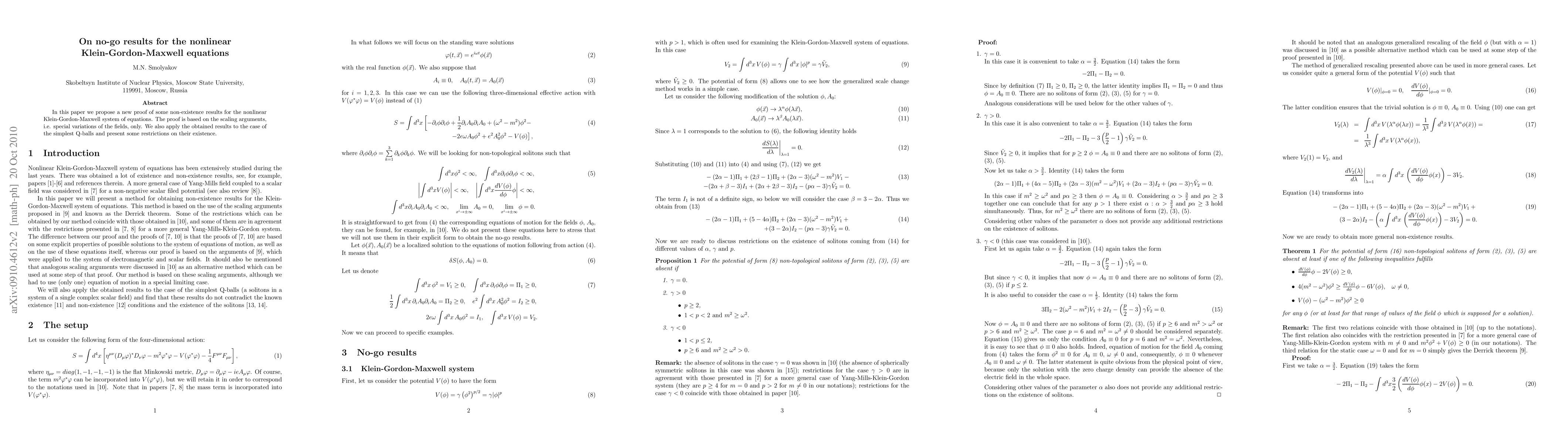 In this paper we propose a new proof of some non-existence results for the nonlinear Klein-Gordon-Maxwell system of equations. The proof is based on the scaling arguments, i.e. special variations of the fields, only. We also apply the obtained results to the case of the simplest Q-balls and present some restrictions on their existence.