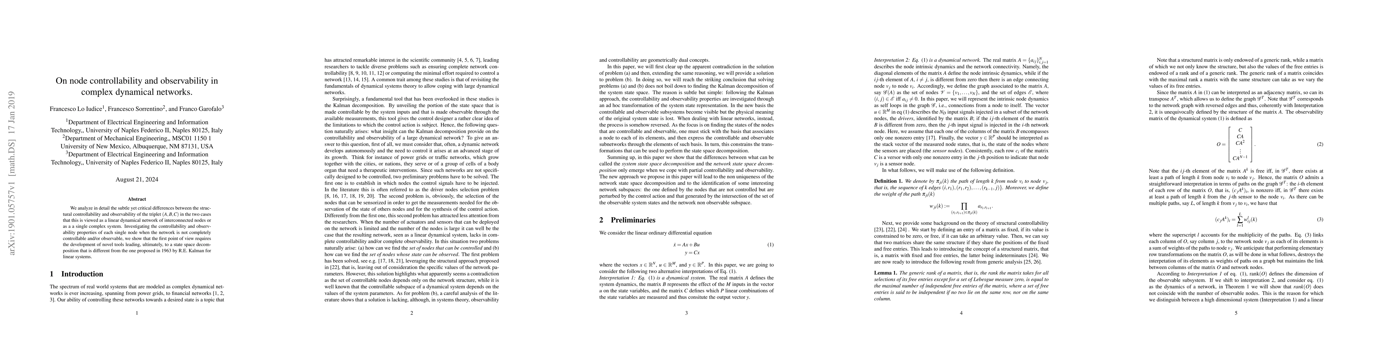 We analyze in detail the subtle yet critical differences between the structural controllability and observability of the triplet $(A,B,C)$ in the two cases that this is viewed as a linear dynamical network of interconnected nodes or as a a single complex system. Investigating the controllability and observability properties of each single node when the network is not completely controllable and/or observable, we show that the first point of view requires the development of novel tools leading, ultimately, to a state space decomposition that is different from the one proposed in 1963 by R.E. Kalman for linear systems.