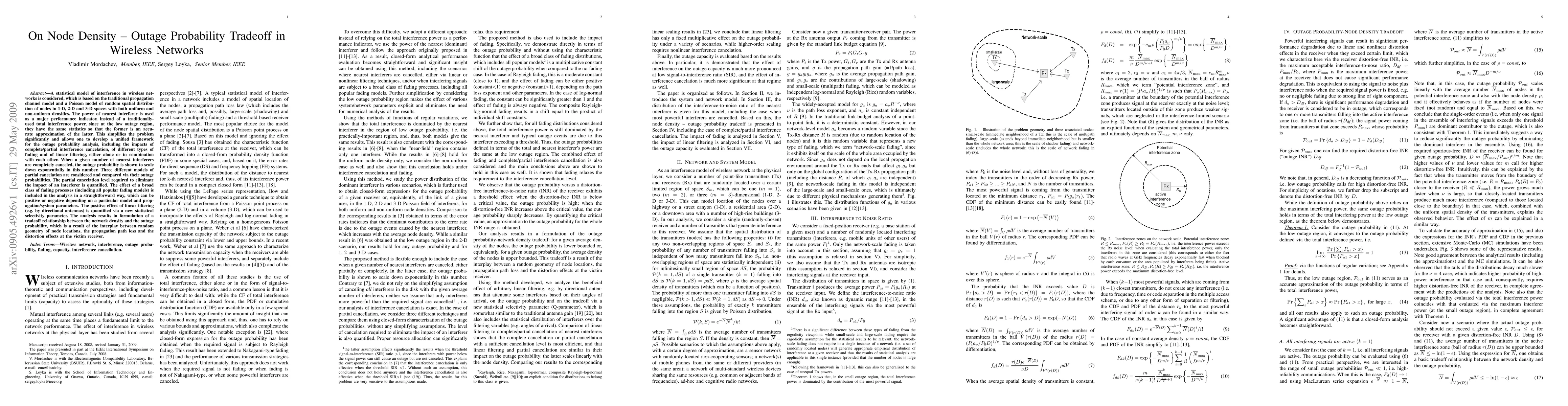 This paper develops a statistical model for interference in wireless networks, focusing on the relationship between node density and outage probability. It uses the power of the nearest interferer as a performance indicator, simplifying the analysis and allowing for a unified framework that considers various interference cancellation techniques and fading effects. The study reveals an exponential scaling of outage probability with complete interference cancelation and quantifies the partial cancelation required to mitigate interference effects.