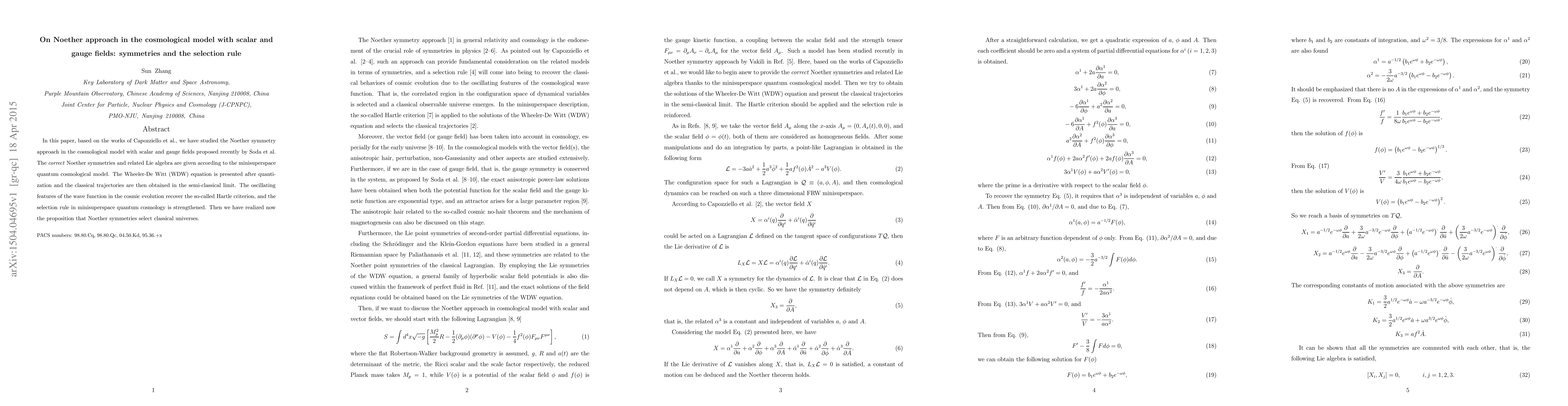 This paper investigates the Noether symmetry approach in a cosmological model with scalar and gauge fields, revealing correct symmetries and related Lie algebra. It quantizes the Wheeler-De Witt equation and demonstrates that Noether symmetries strengthen the selection rule in minisuperspace quantum cosmology, supporting the proposition that Noether symmetries select classical universes.
